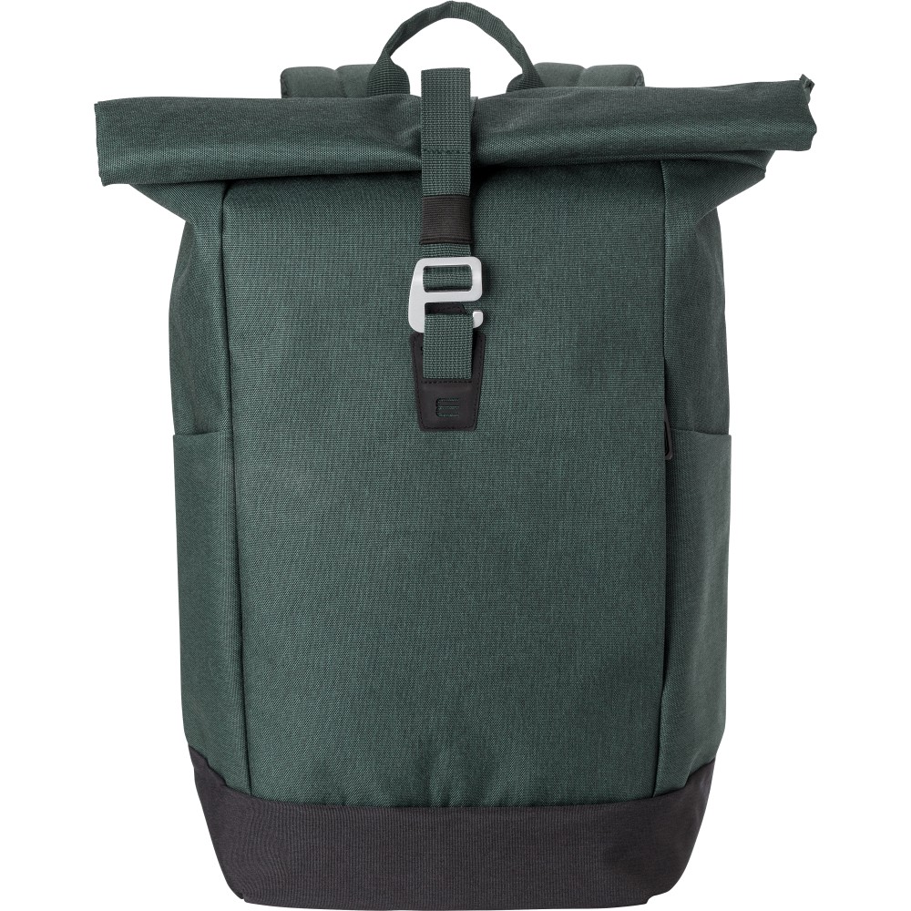 Polyester (600D) roll-top backpack. One large zippered compartment with two slip pockets and a laptop compartment. Zippered compartment in the front. Padded backside and straps. Metal hook for closure.