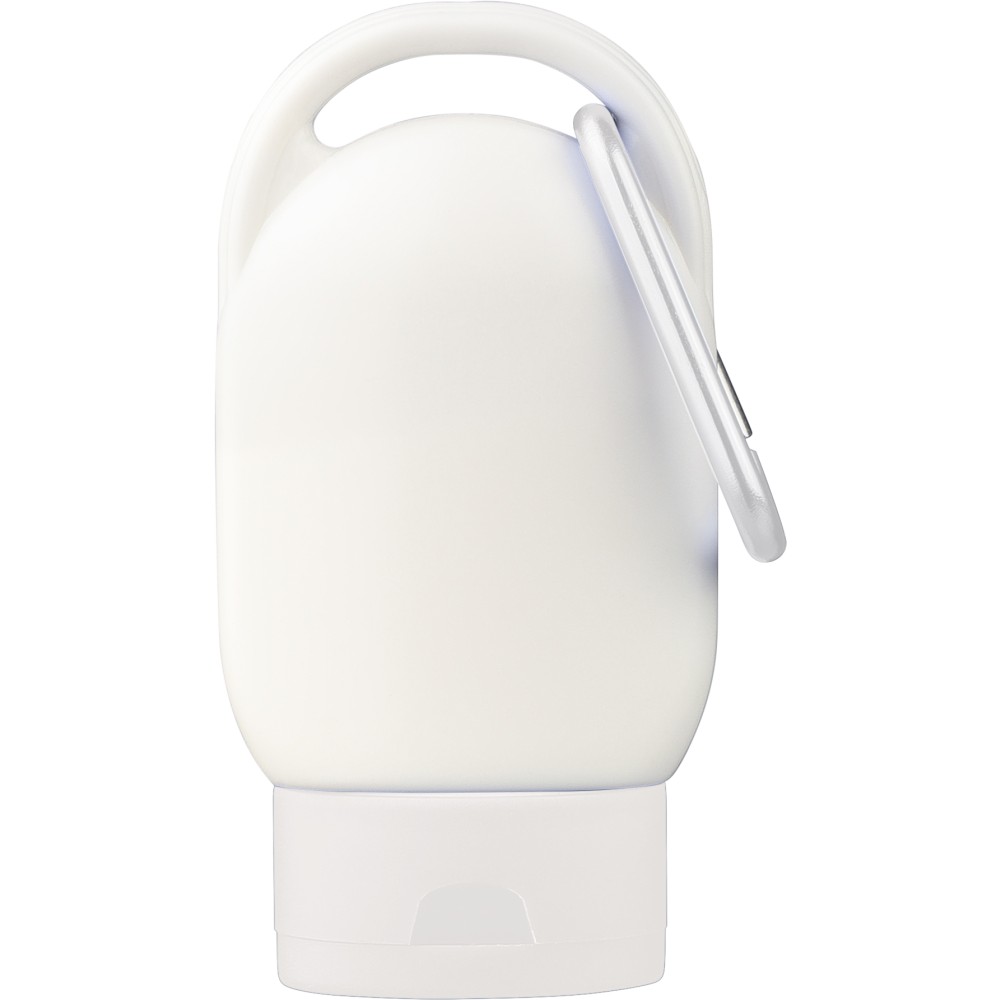 Sunscreen lotion with SPF30 in a 30 ml tube. Features a colored cap and matching carabiner for easy attachment. Backside includes ingredient list and best-before date. Shelf life of 2 years.