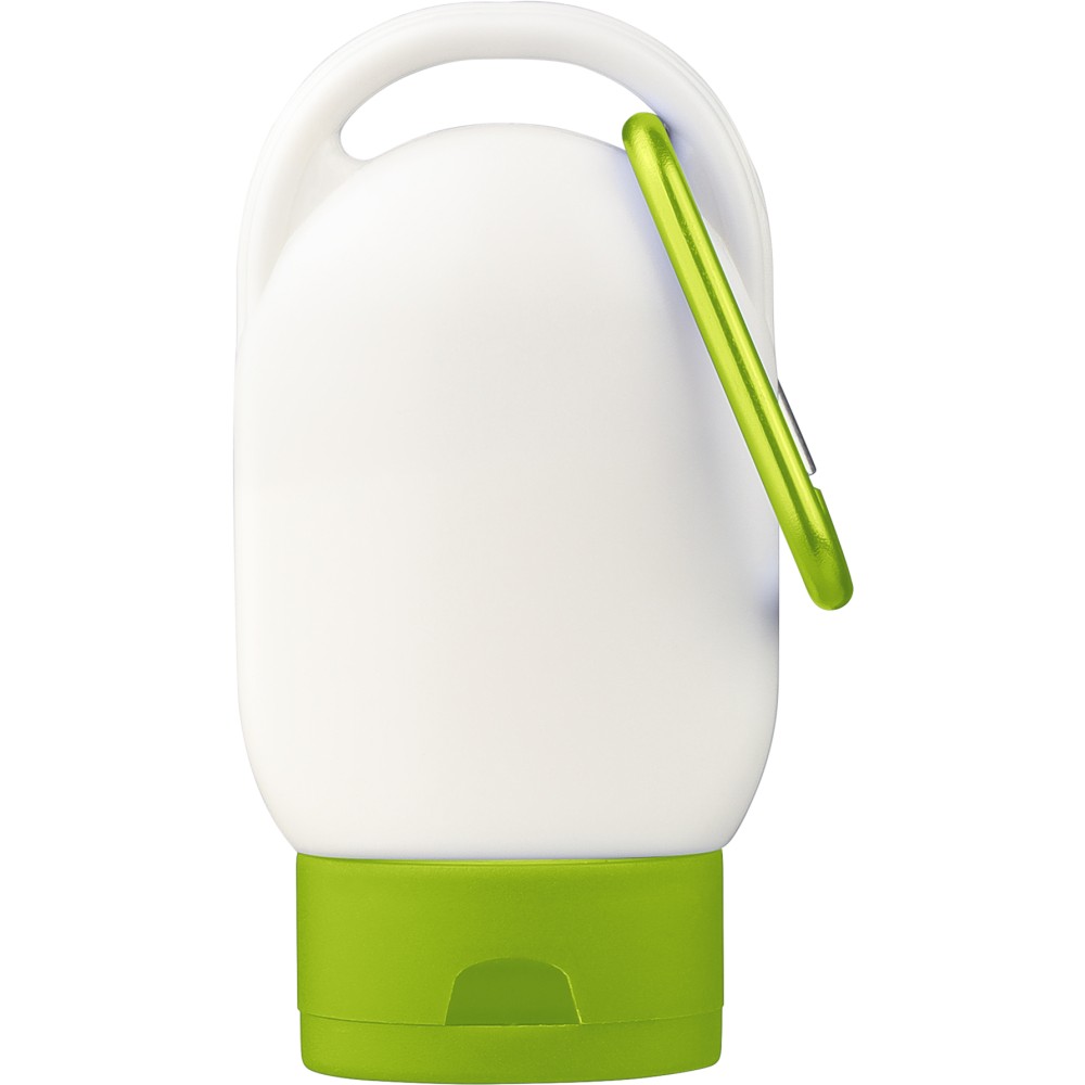 Sunscreen lotion with SPF30 in a 30 ml tube. Features a colored cap and matching carabiner for easy attachment. Backside includes ingredient list and best-before date. Shelf life of 2 years.