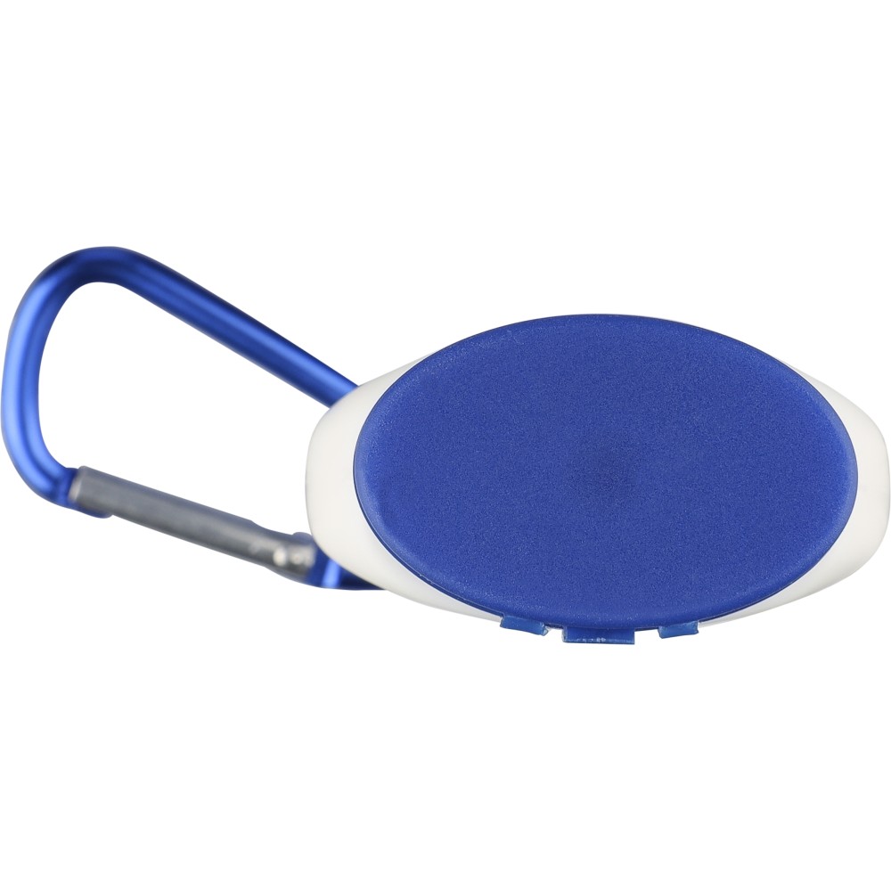 Sunscreen lotion with SPF30 in a 30 ml tube. Features a colored cap and matching carabiner for easy attachment. Backside includes ingredient list and best-before date. Shelf life of 2 years.