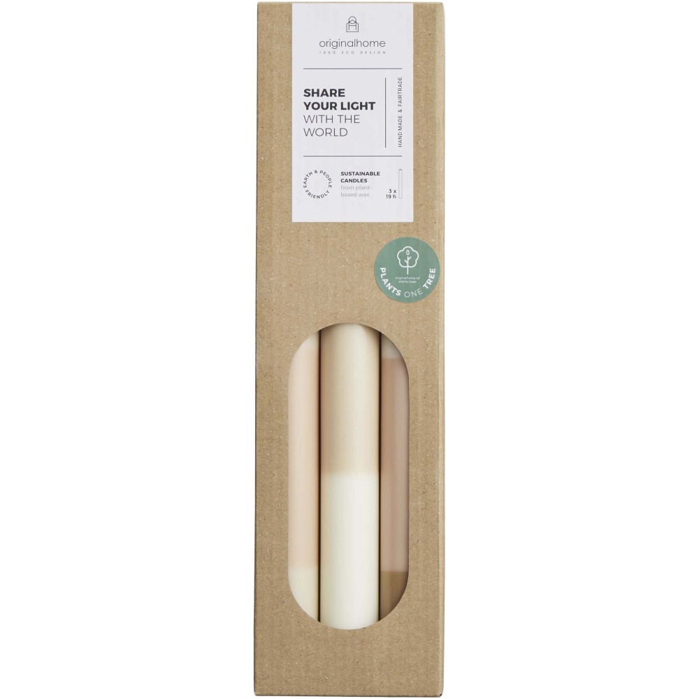 These dinner limestone candles feature a vibrant, layered colour palette and are handmade from plant-based, paraffin-free wax. They are unscented, have a 100% cotton wick, and burn cleanly. Each purchase plants a tree for farmers in Africa and supports a special fair trade project in Java, Indonesia. Available in a variety of stunning colours. Set of three. Candle burn time: 18?20 hours.