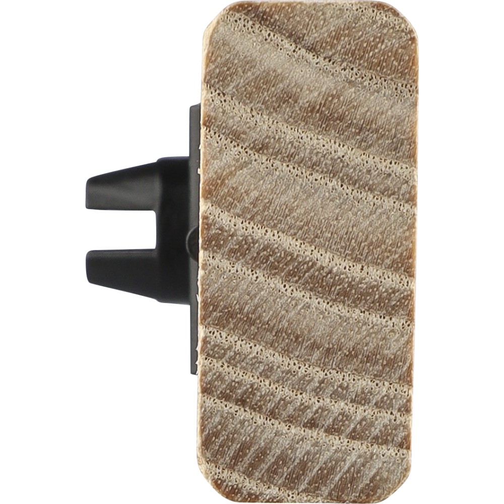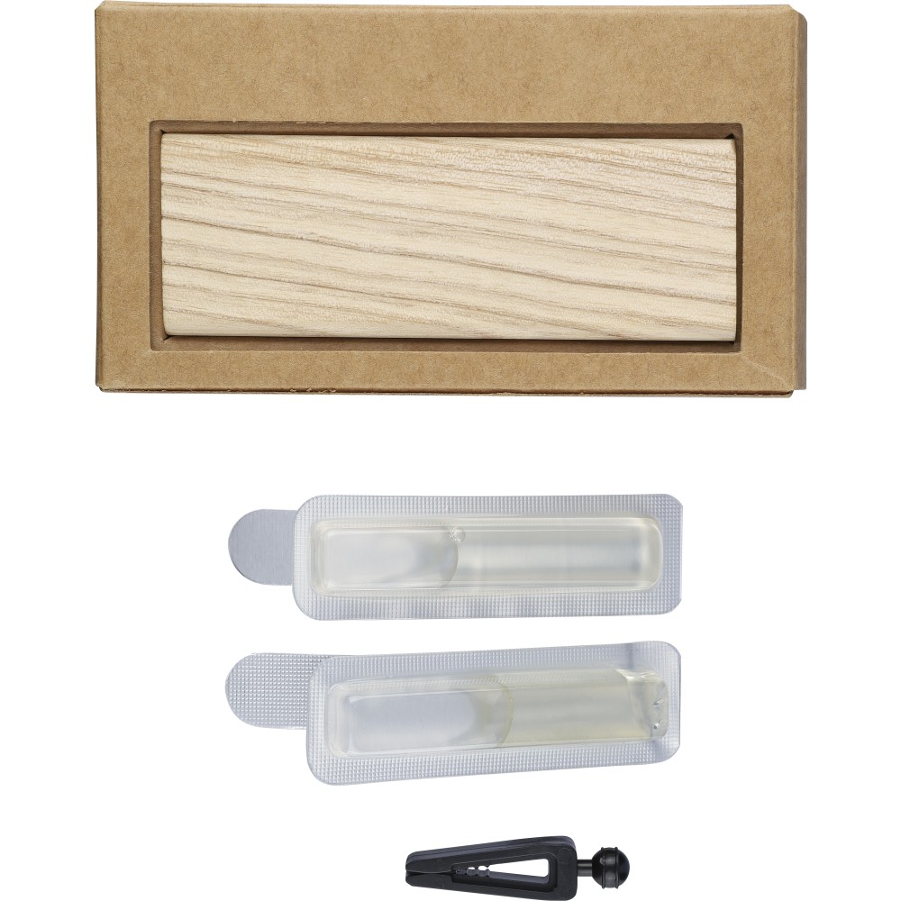 Natural beechwood car refresher with 2 × 3 g alcohol-free sandalwood scent (one pre-filled, one refill). Includes ABS clip for car vent. Packed in brown cardboard box with illustration.