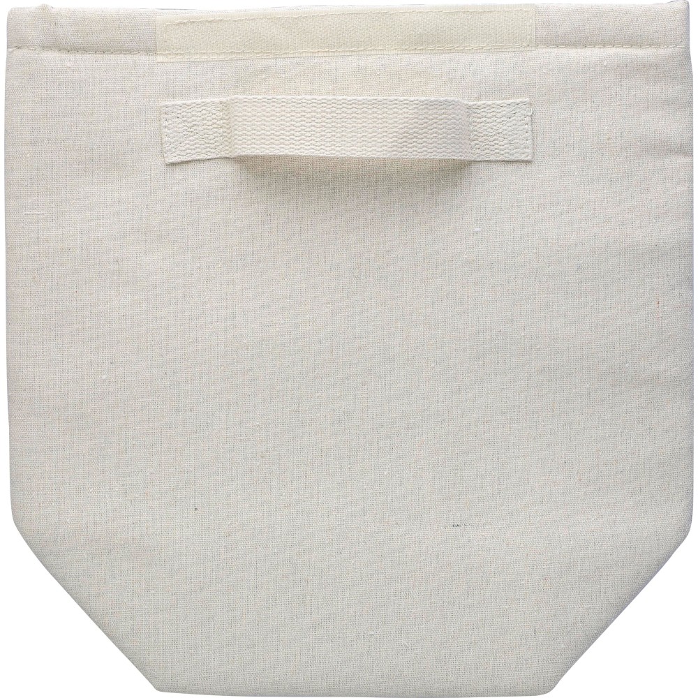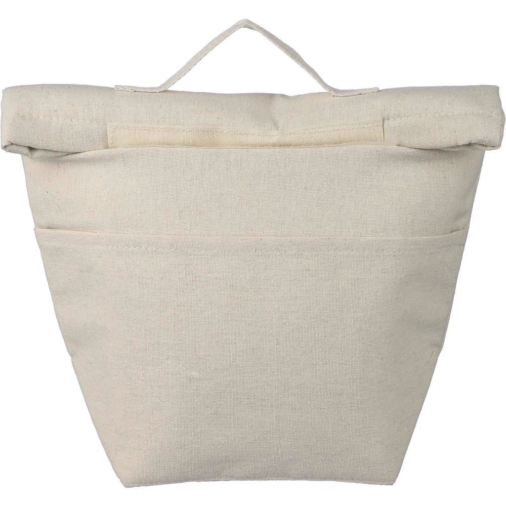 Recycled cotton (220 gsm) rolltop cooler bag with 3 mm EPE and 12C PEVA lining inside. Features Velcro closure, a small front pocket, and a short carrying strap on top. Includes recycled cotton label on the outside.
