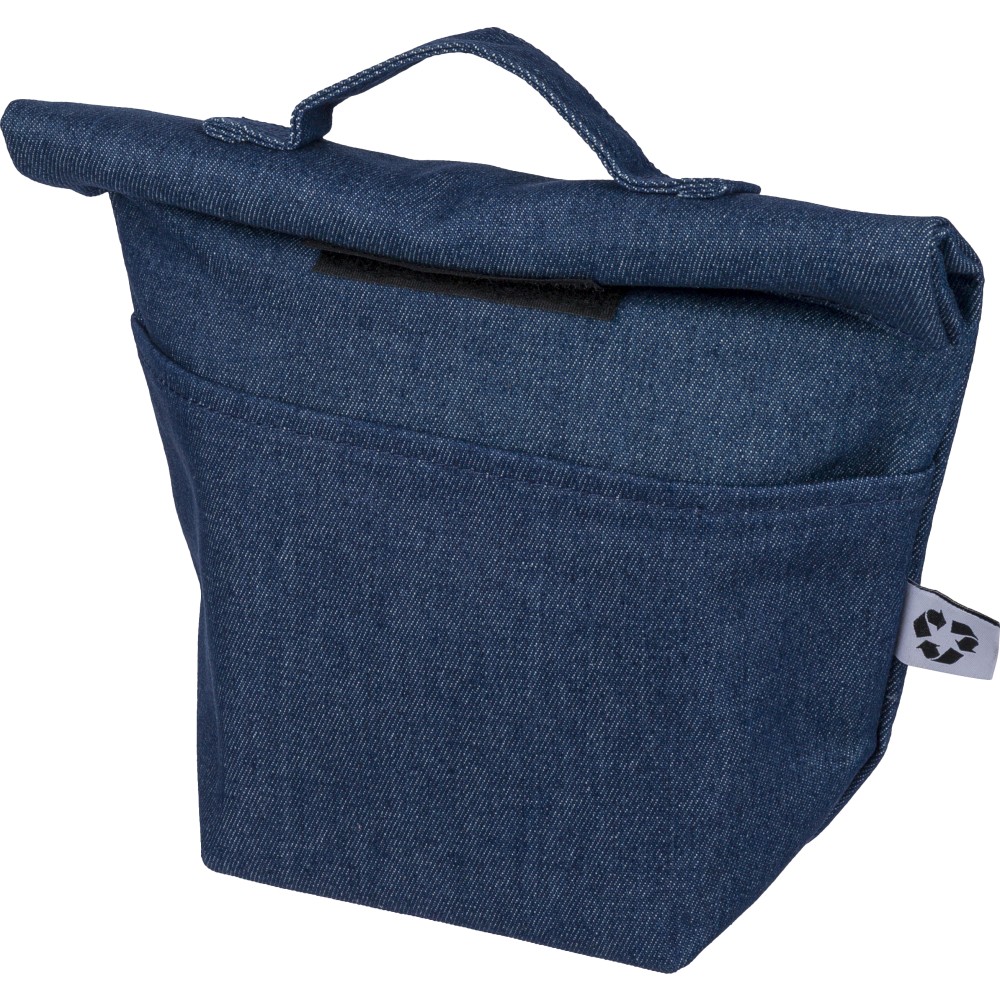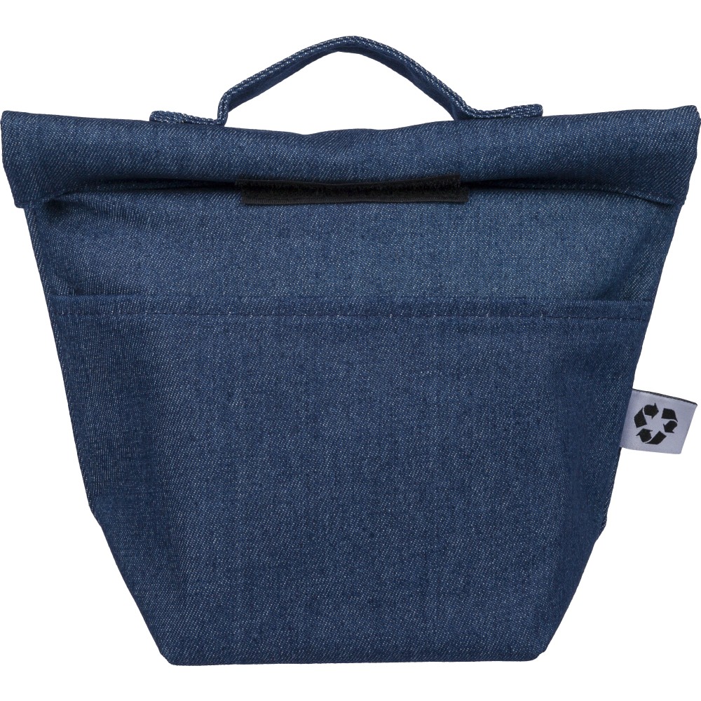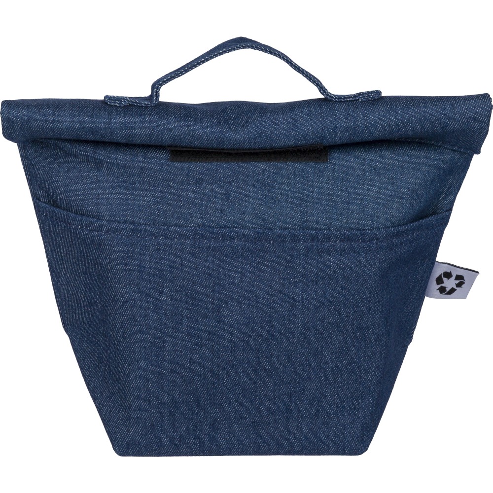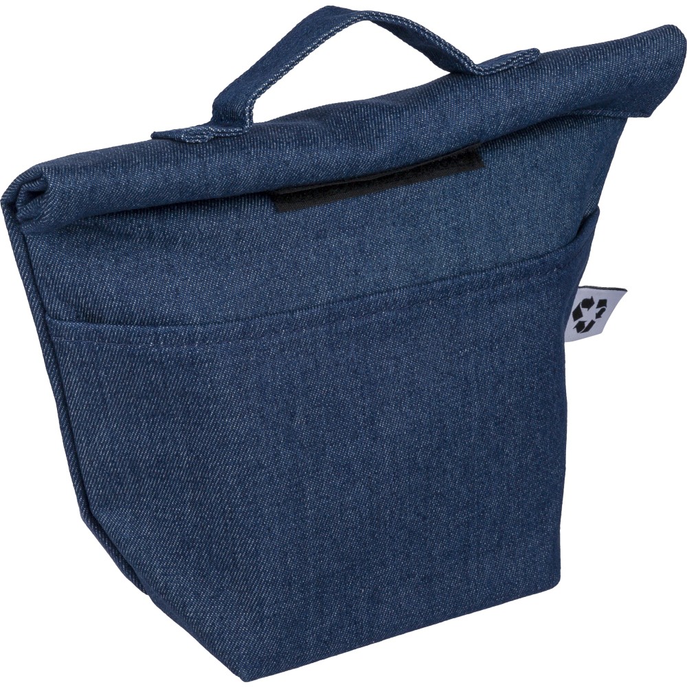Recycled denim cooler roll-top bag with size 27 x 10 x 31 cm. With velcro closing, PEVA interior and a short carrying handle. Features a front pocket and a recycled label on the outside.
