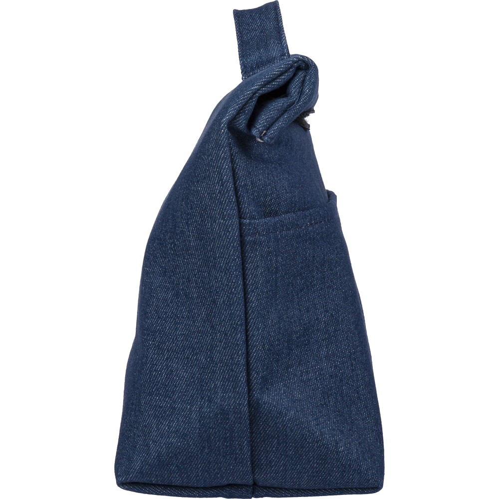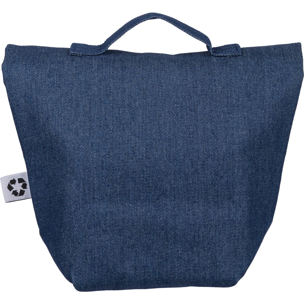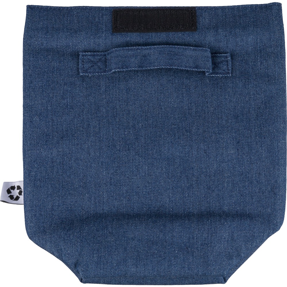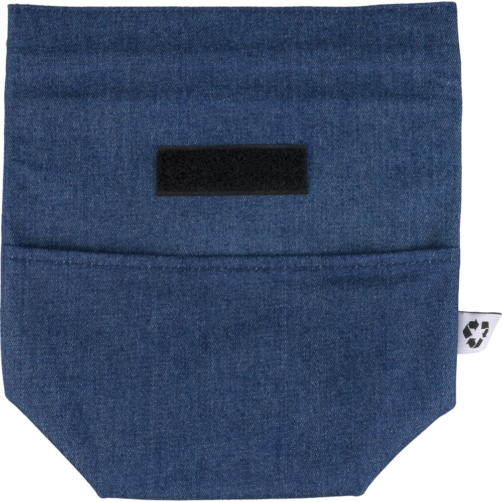 Recycled denim cooler roll-top bag with size 27 x 10 x 31 cm. With velcro closing, PEVA interior and a short carrying handle. Features a front pocket and a recycled label on the outside.