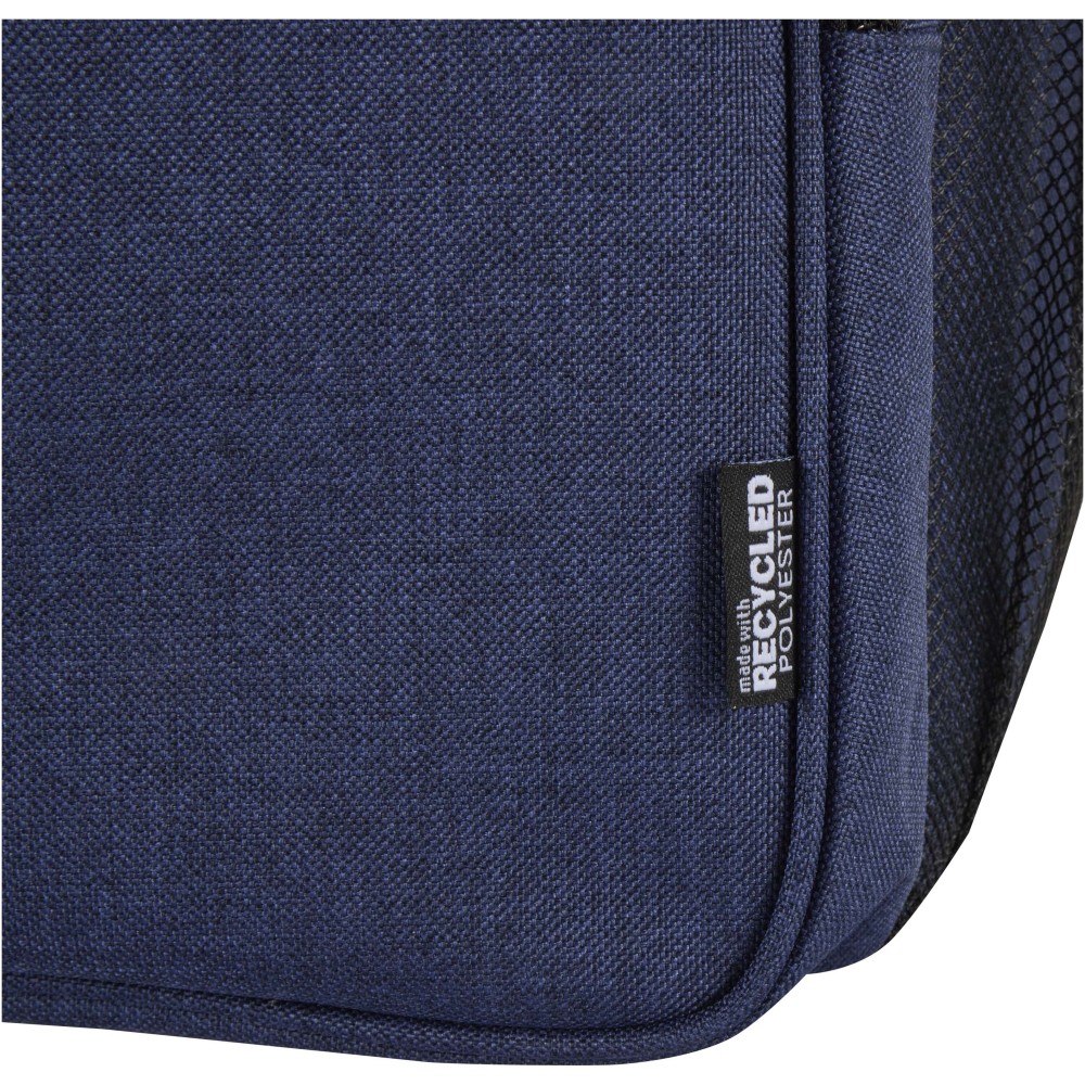 The Tundra picnic cooler backpack is made from GRS certified recycled materials and comes with a reusable two-person cutlery set made from food-grade plastic. Its leak-proof main compartment, insulated with high-density foam and a heat-sealed PEVA lining, keeps food and drinks chilled for hours. For added convenience, it includes two side mesh pockets, a zipped front pocket with tableware (two knives, two forks, two cups, and two plates), and an extra zipped pocket on top. Padded adjustable shoulder straps and a sturdy webbing handle make it comfortable to carry, making this backpack an ideal companion for picnics, outdoor dining, camping, or beach trips. Volume capacity: 20 litres.