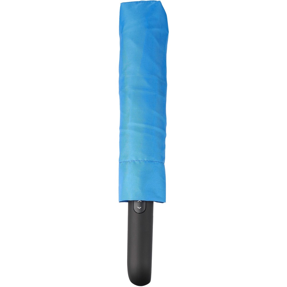 rPET 190T foldable automatic umbrella (21 inch) with six panels and a steel frame. Features an rPET label on the Velcro closure and a plastic carabiner handle. Includes pouch. Windproof.