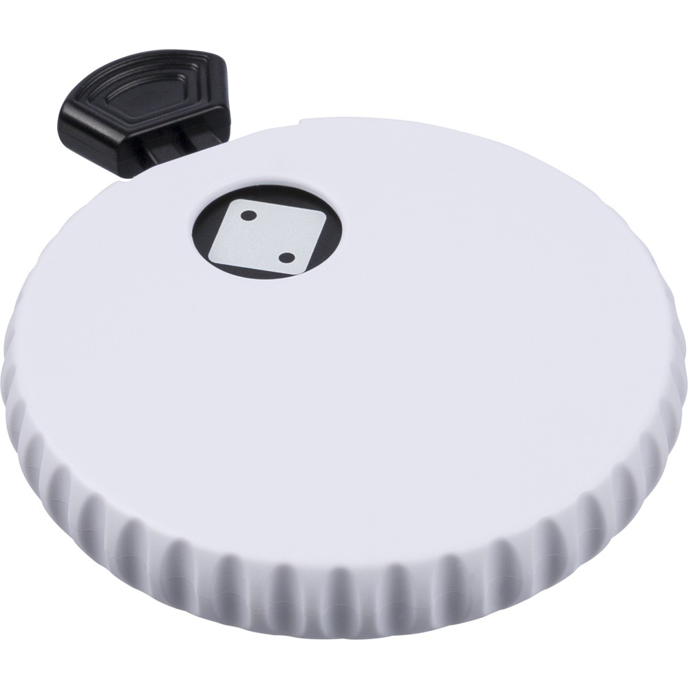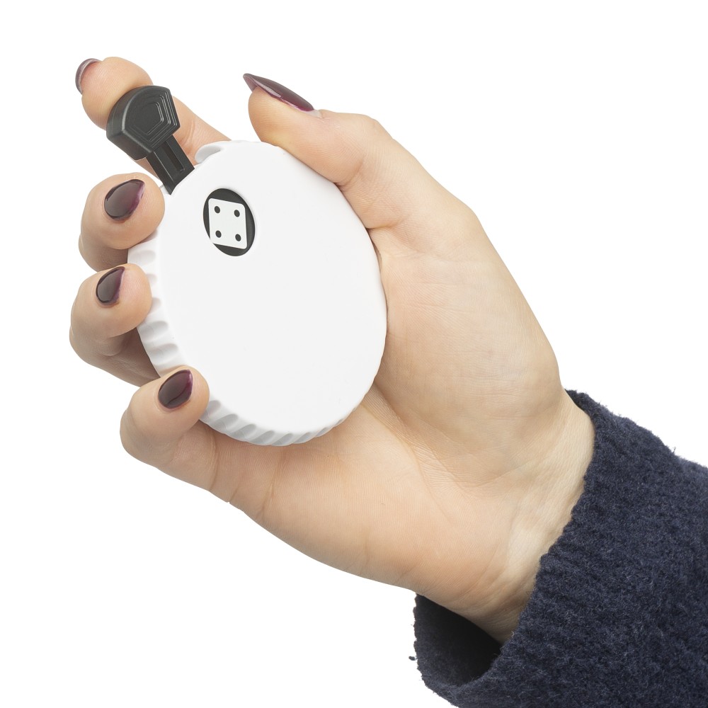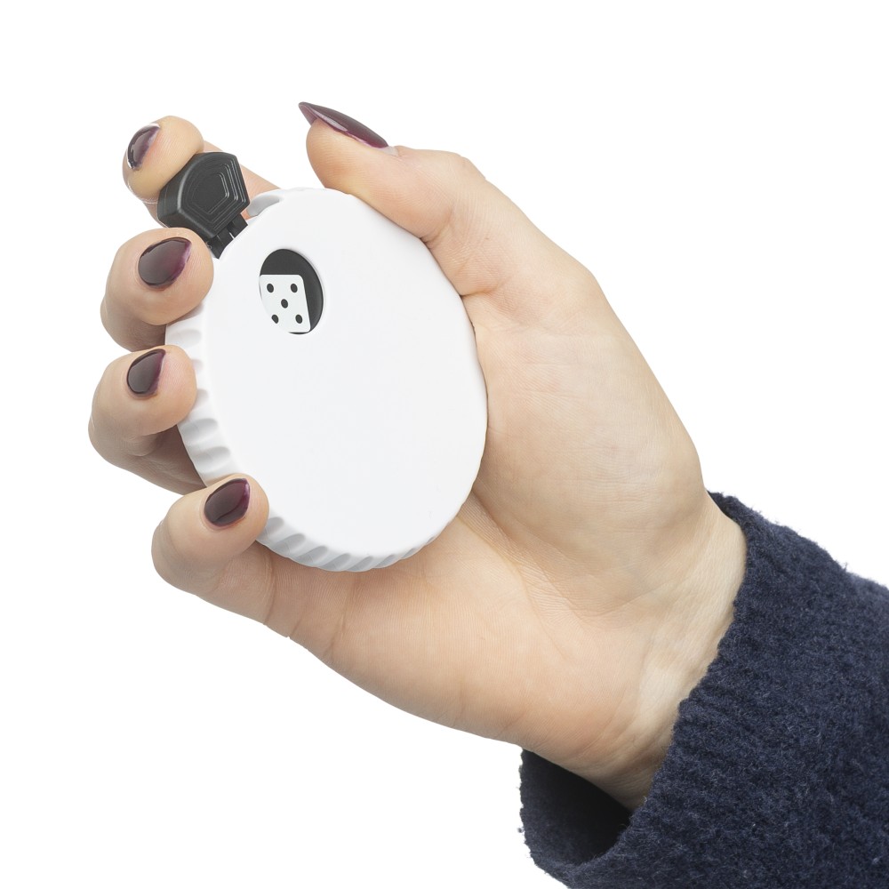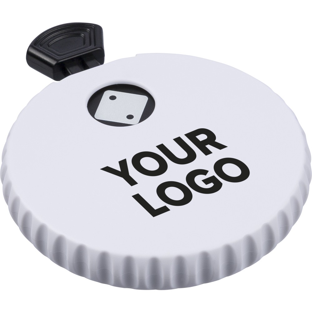 Recycled ABS mechanical dice with push button on the top. Press to spin the internal mechanism and reveal a random number from 1 to 6. Includes a bottle opener on the back and a small Recycled ABS logo. Packed in a recycled polybag.