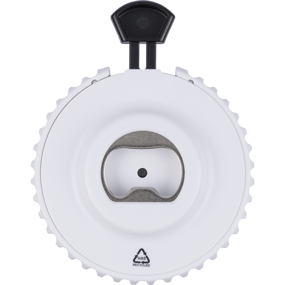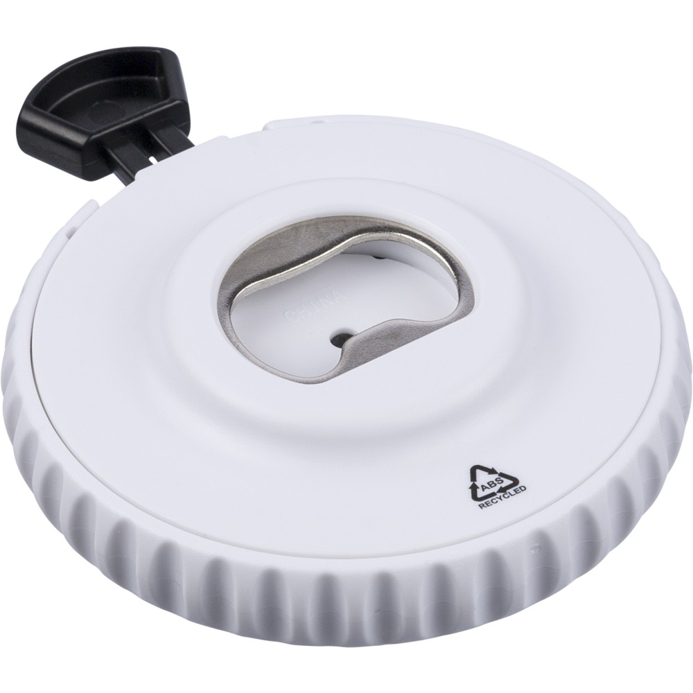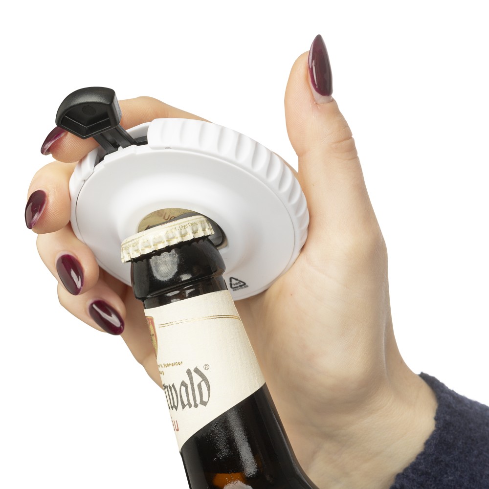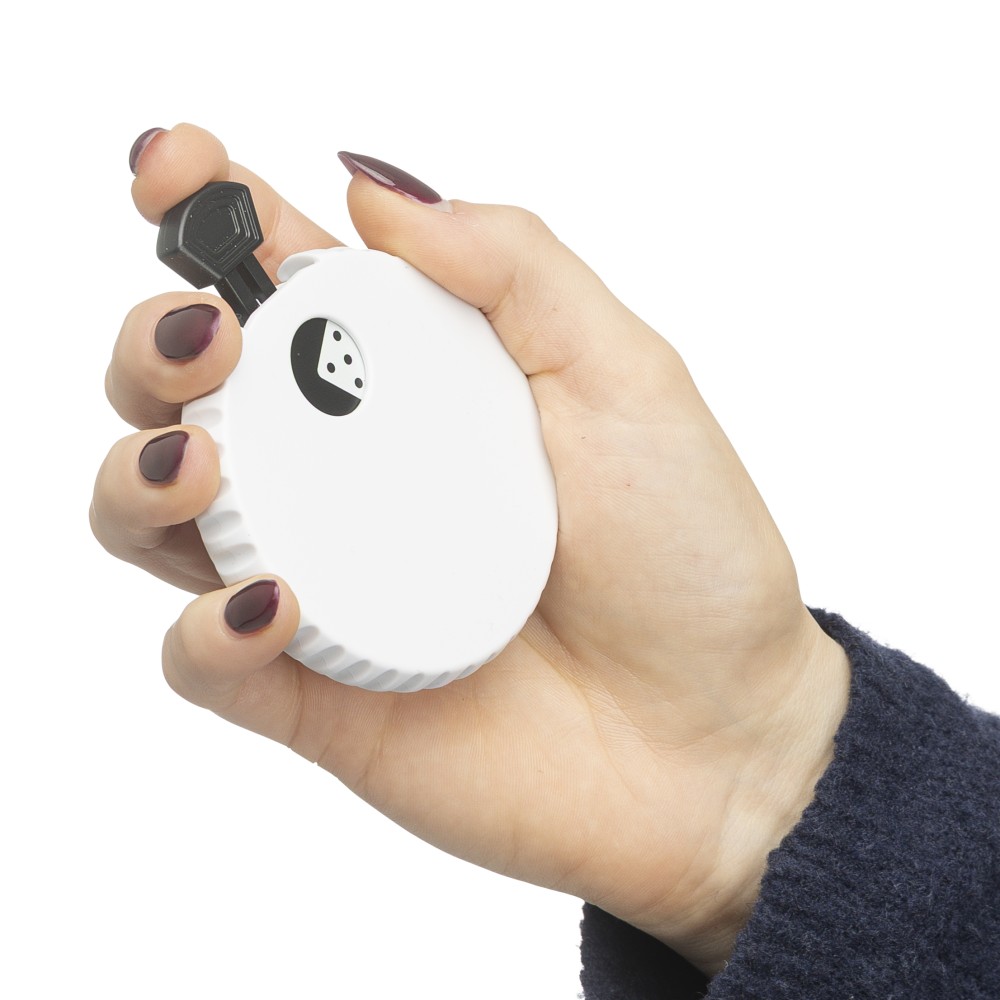 Recycled ABS mechanical dice with push button on the top. Press to spin the internal mechanism and reveal a random number from 1 to 6. Includes a bottle opener on the back and a small Recycled ABS logo. Packed in a recycled polybag.