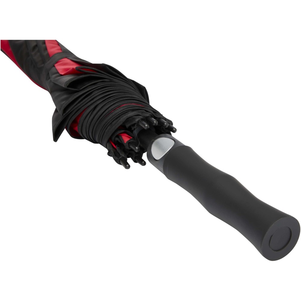 The Jeff windproof golf umbrella is designed with a spacious 55" polyester canopy, comfortably shielding multiple people from the elements. The robust fibreglass shaft and frame provide excellent flexibility, offering strong resistance against high winds. A practical plastic handle with an auto-open button ensures quick and easy operation. The contrasting canopy panels present a perfect opportunity for bold, eye-catching branding?ideal for events, promotions, or everyday use.