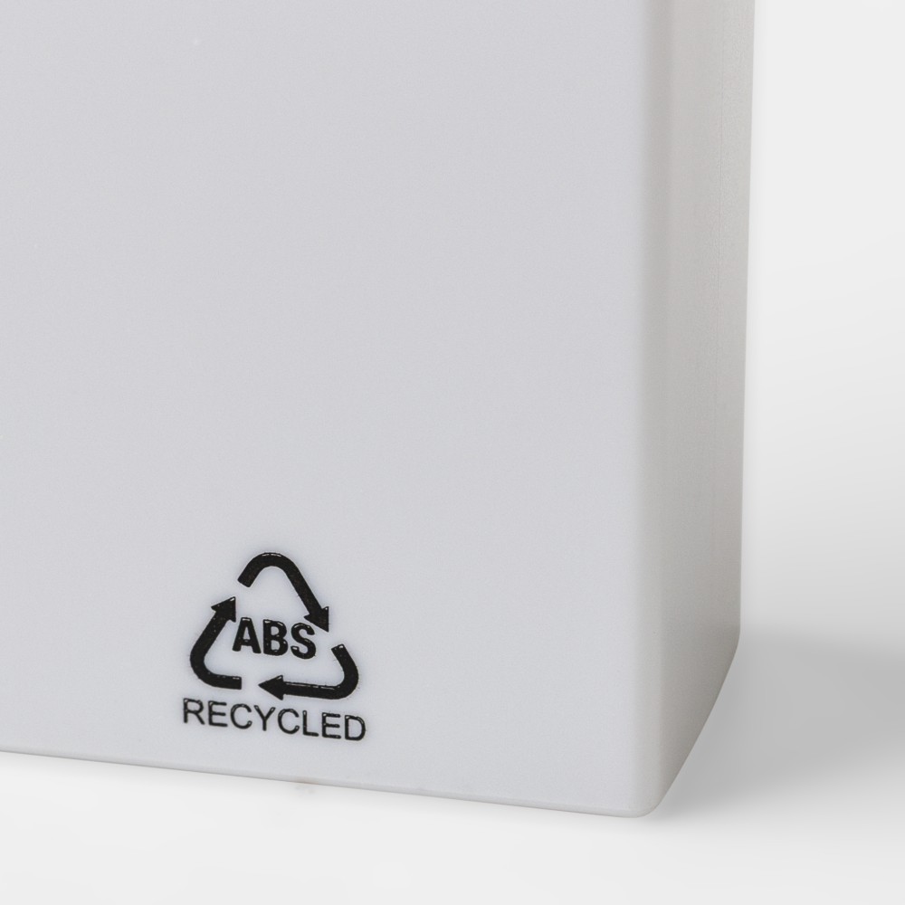 Recycled ABS text marker with white body and colored detail. Features a click closure and includes a 2-year warranty against drying out. Marked with the Recycled ABS logo.