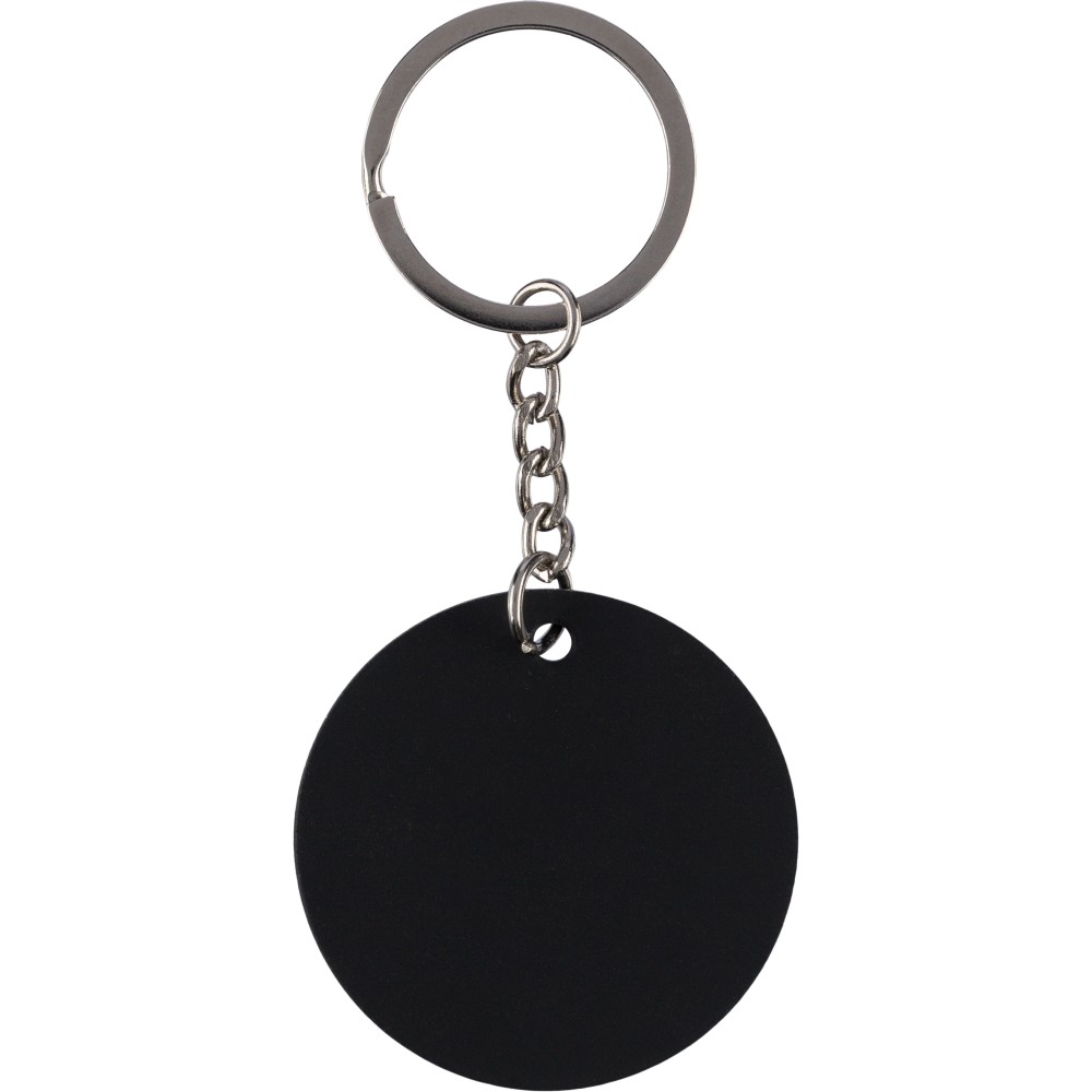 Recycled stainless steel rubberized keychain with metal ring in a round shape. Features an engraved recycled logo that reveals a shiny mirror effect after engraving. Individually packed in a kraft paper envelope.