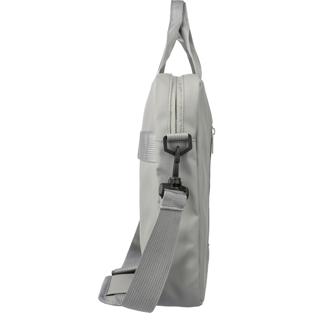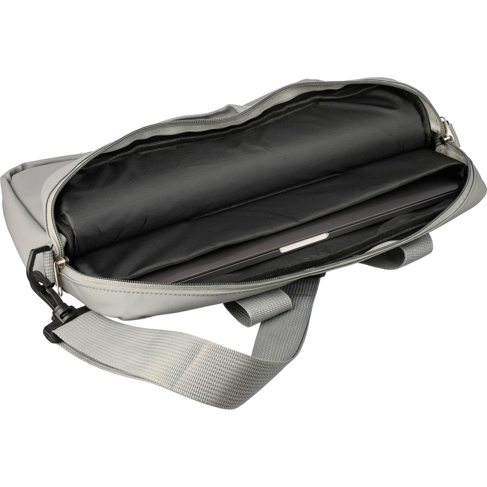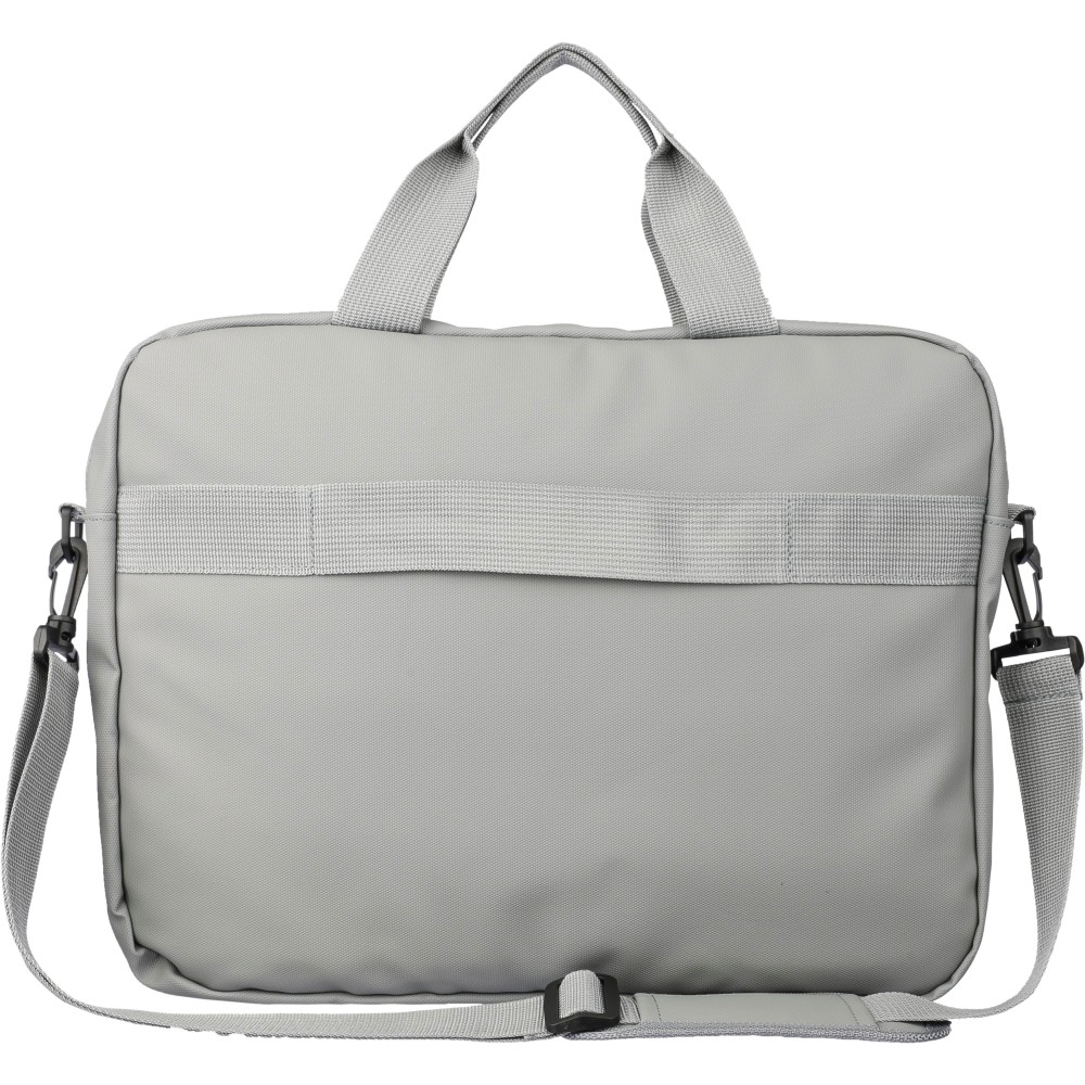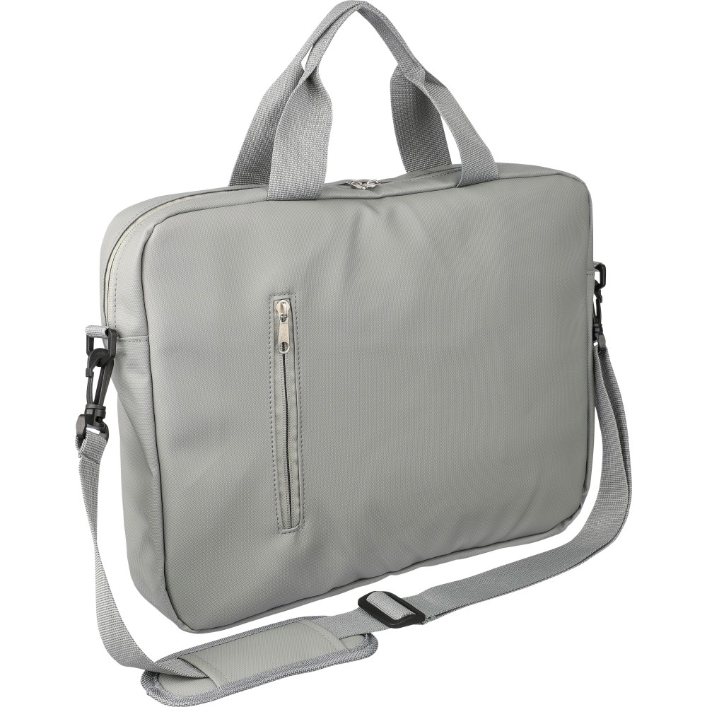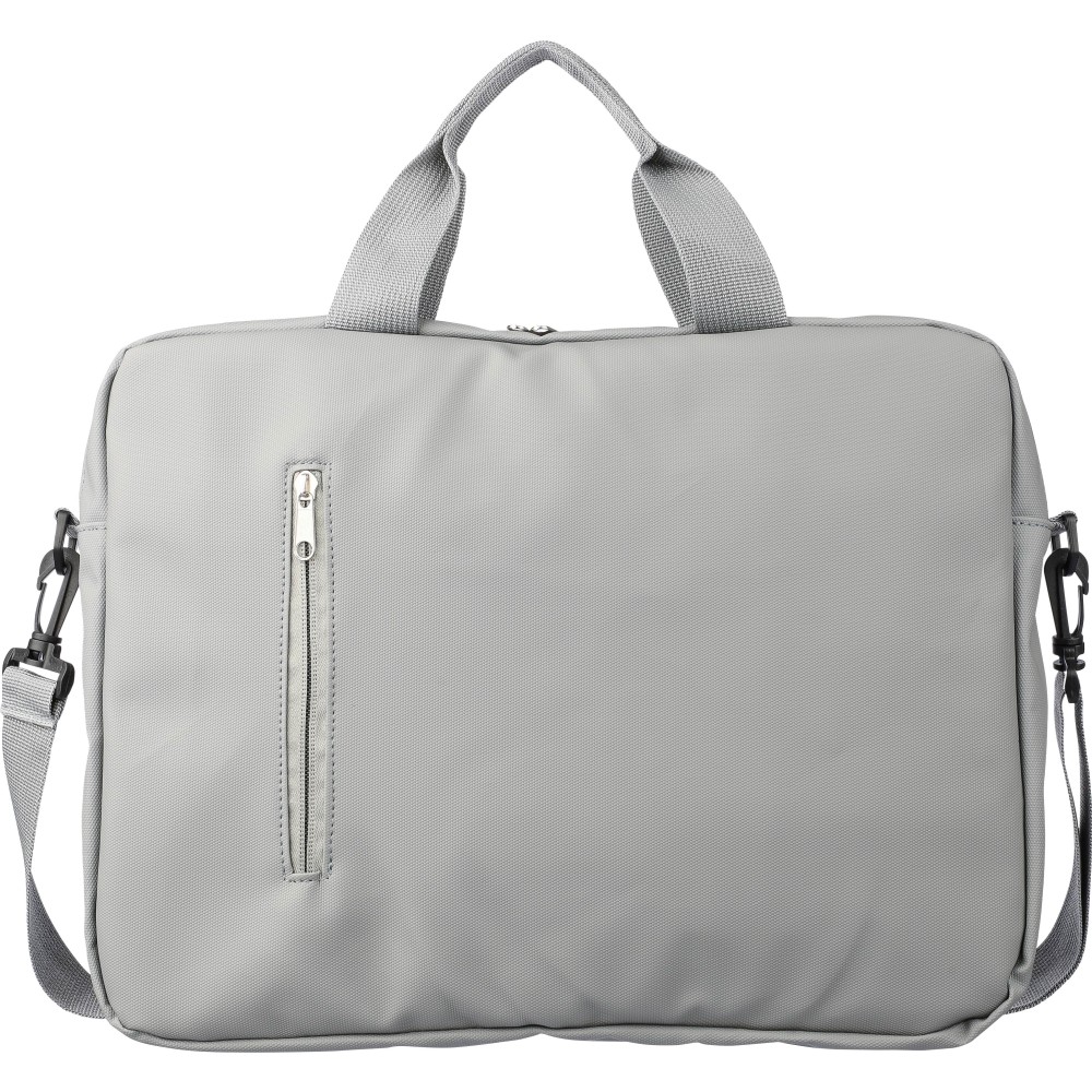 PU laptop bag (15 inch) with two zippered front pockets, a large zippered compartment with a Velcro-closed laptop section, and multiple inserts inside. Includes adjustable carrying straps and two handles. Water repellent.