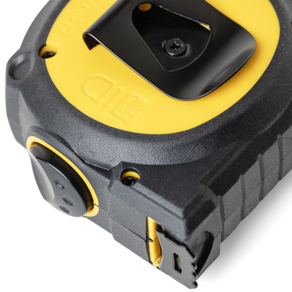 ABS and TPR tape measure with 3 m long, 16 mm wide double-sided metal tape. Transparent top window for precise inside measurements. Includes lock/release function, back clip, and polyester wrist strap. Packed in brown carton box with illustration.