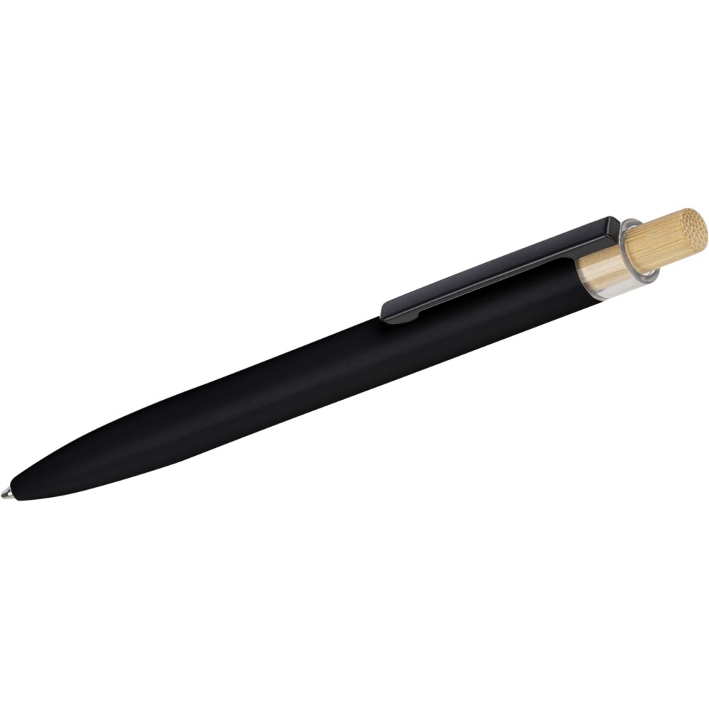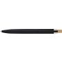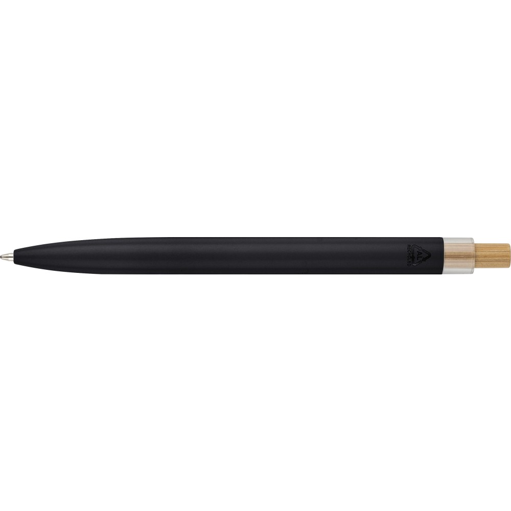 Recycled aluminium lacquered push ballpen with bamboo pusher, rPET trim, and metal clip. Features an engraved recycled logo. Approximate writing length of 700 metres. Blue ink.
