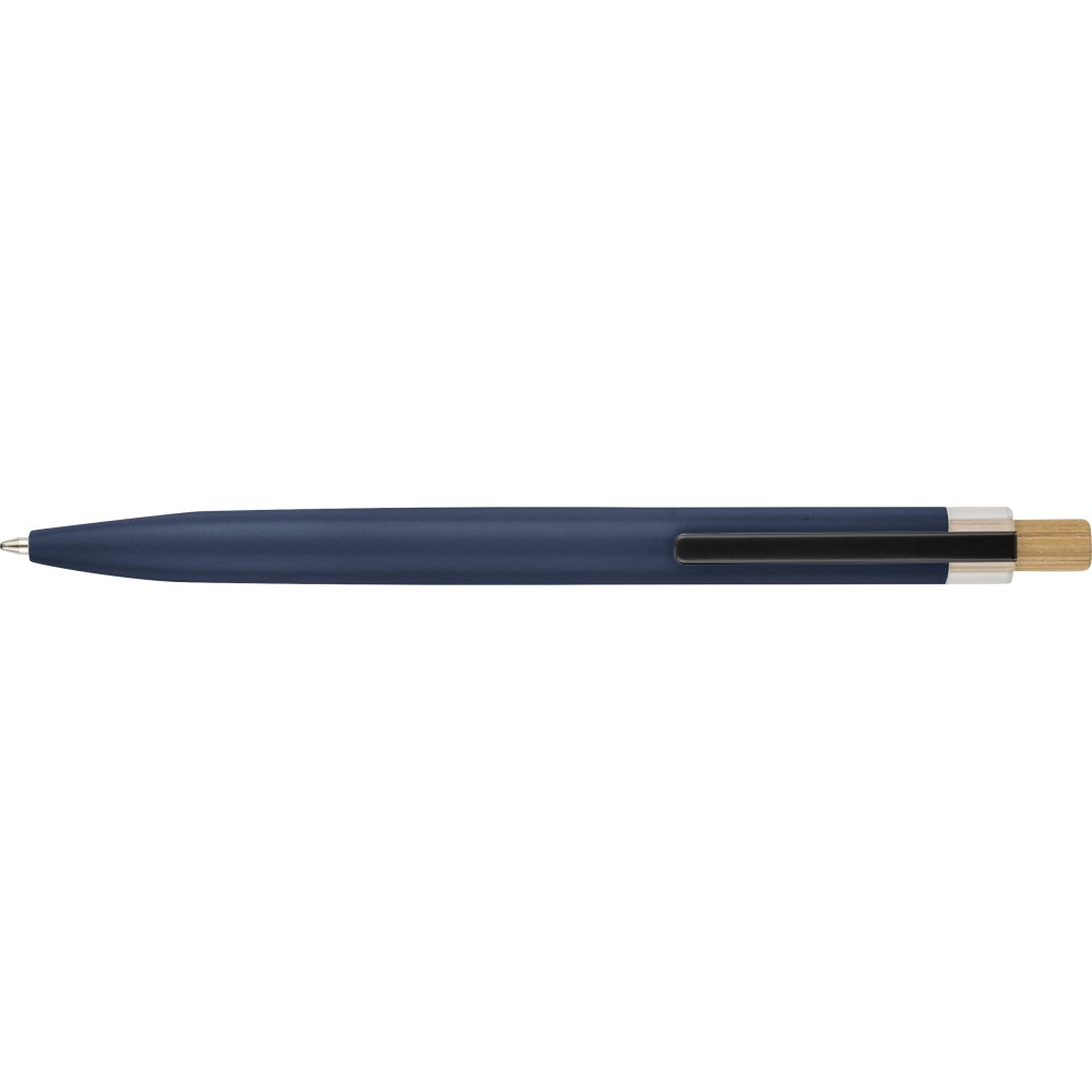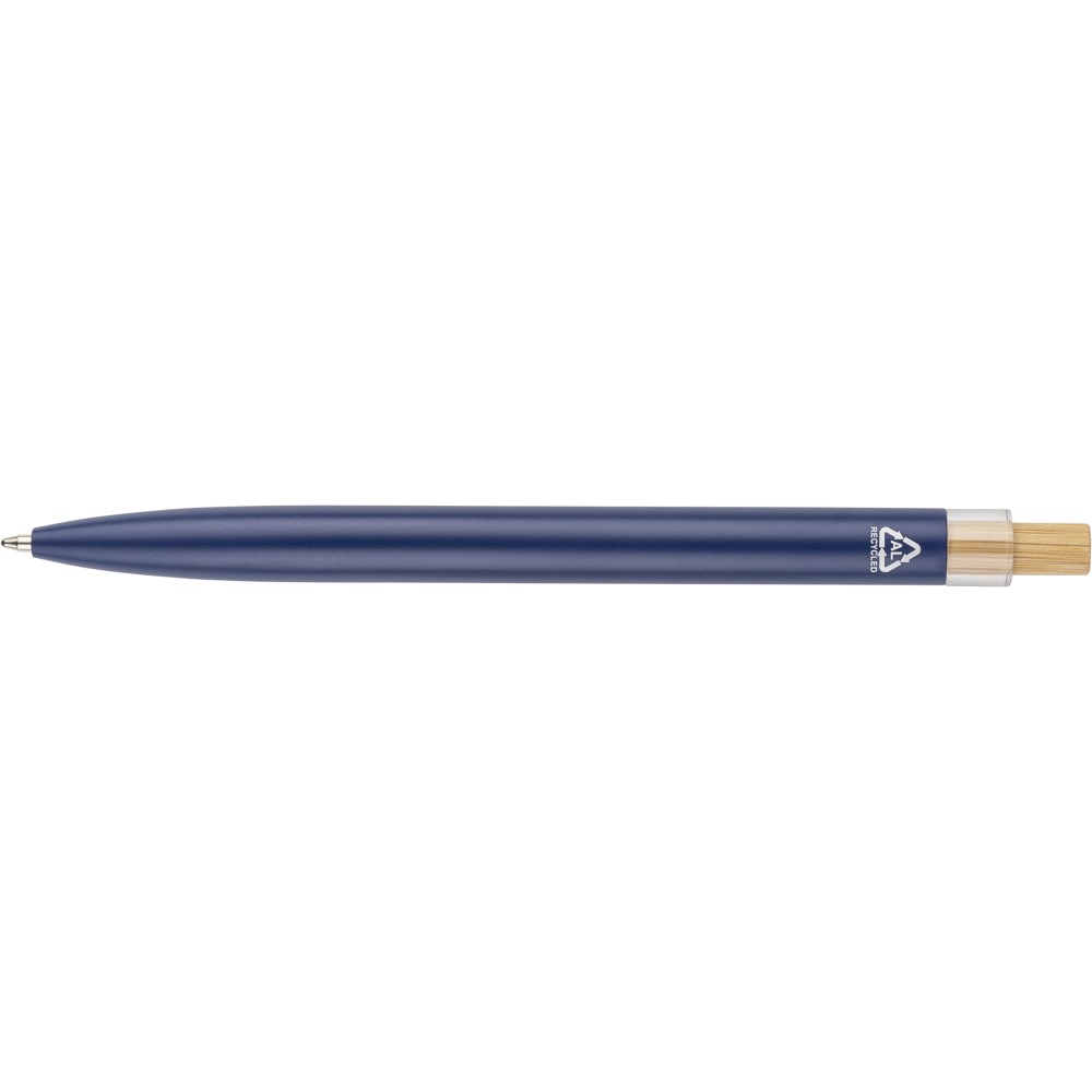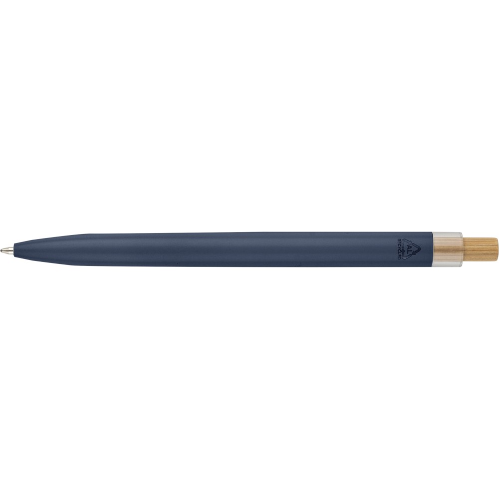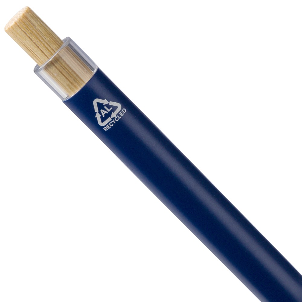 Recycled aluminium lacquered push ballpen with bamboo pusher, rPET trim, and metal clip. Features an engraved recycled logo. Approximate writing length of 700 metres. Blue ink.