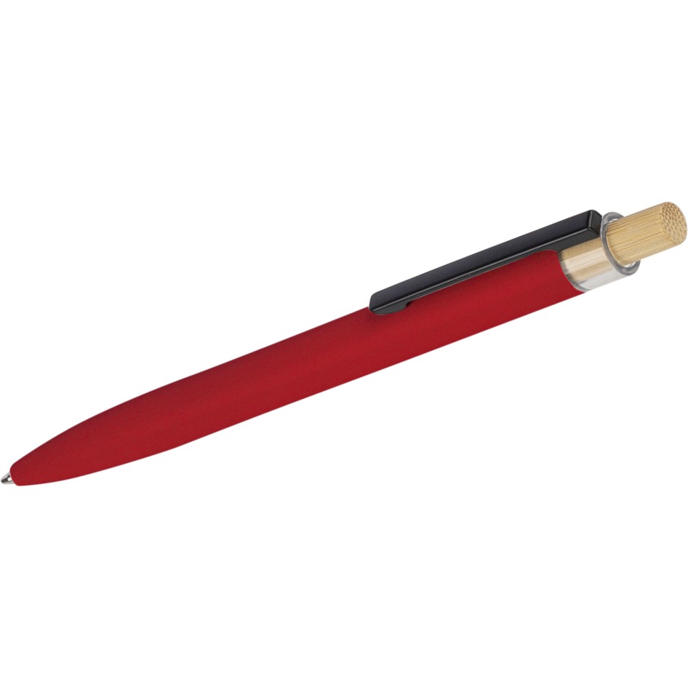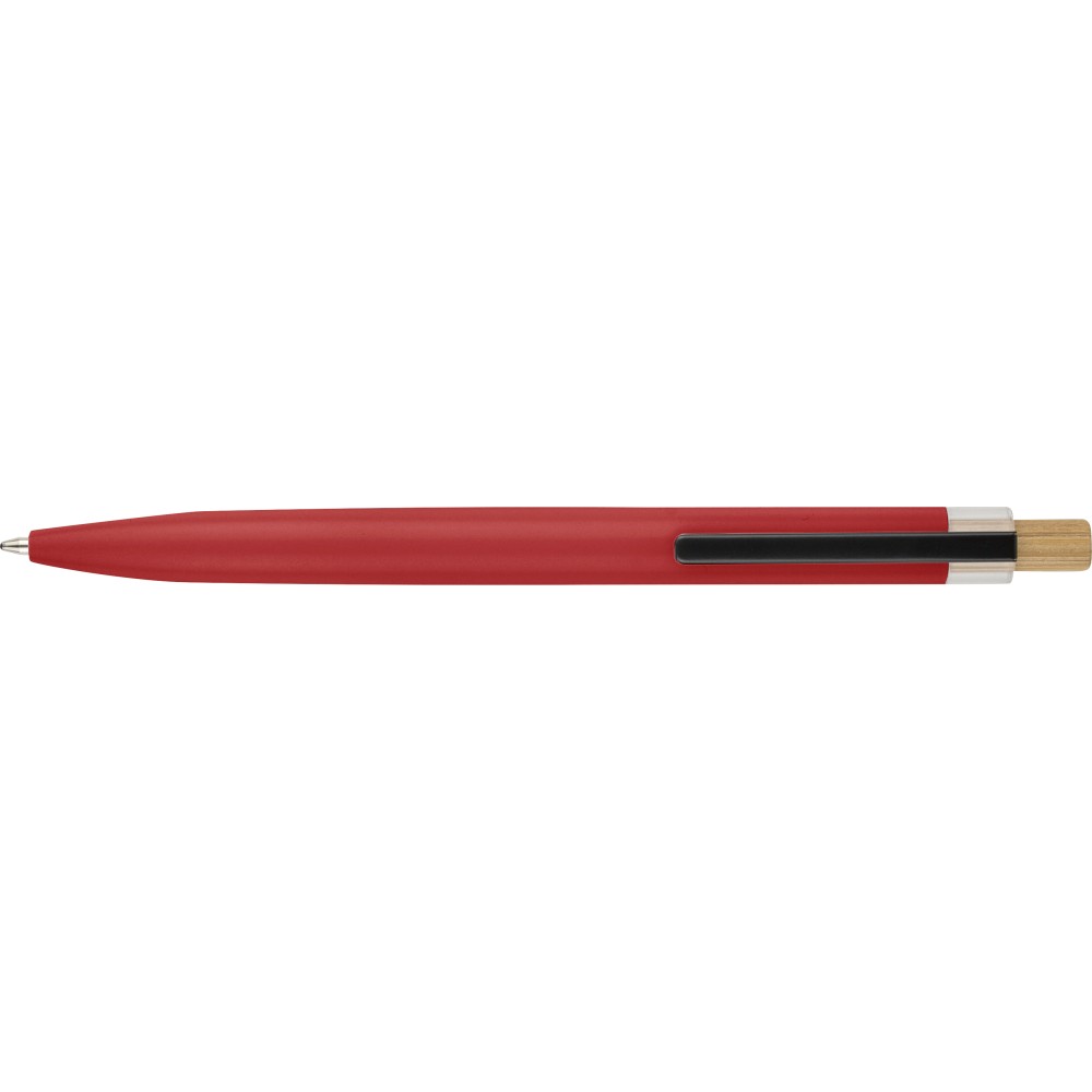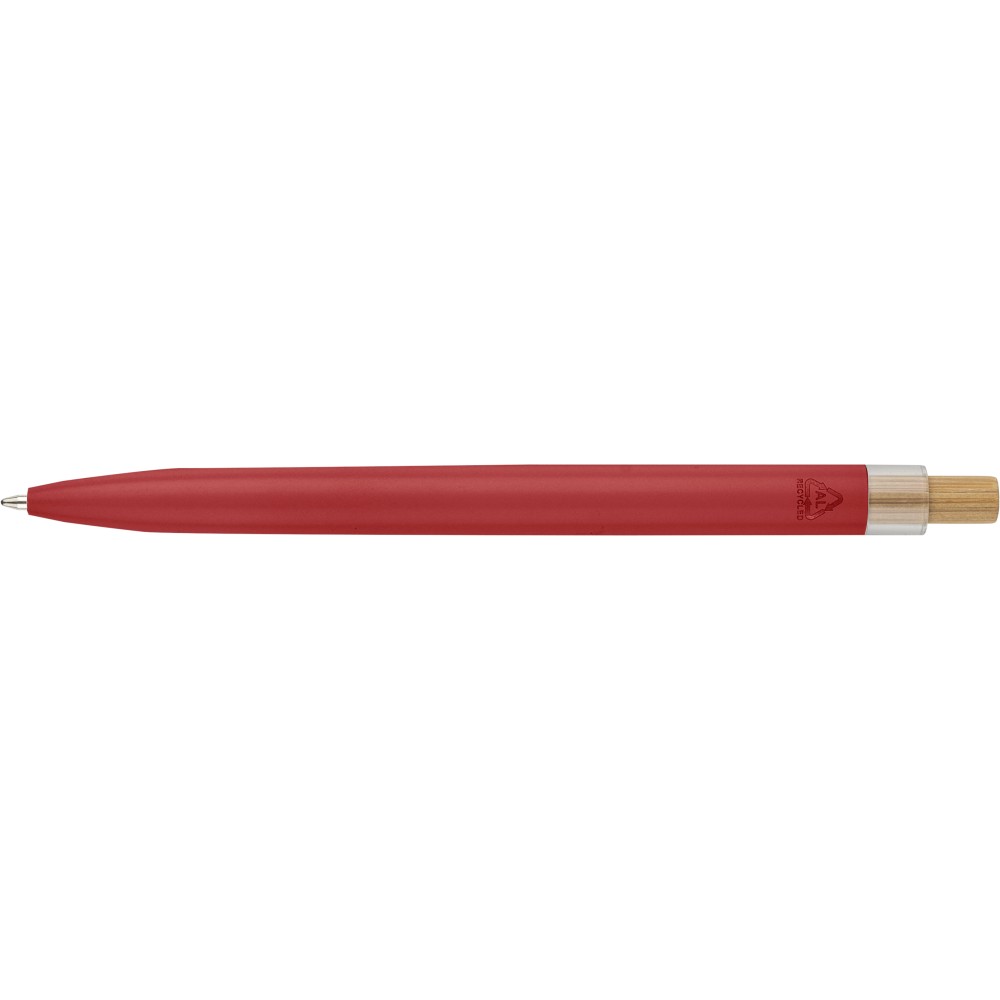 Recycled aluminium lacquered push ballpen with bamboo pusher, rPET trim, and metal clip. Features an engraved recycled logo. Approximate writing length of 700 metres. Blue ink.