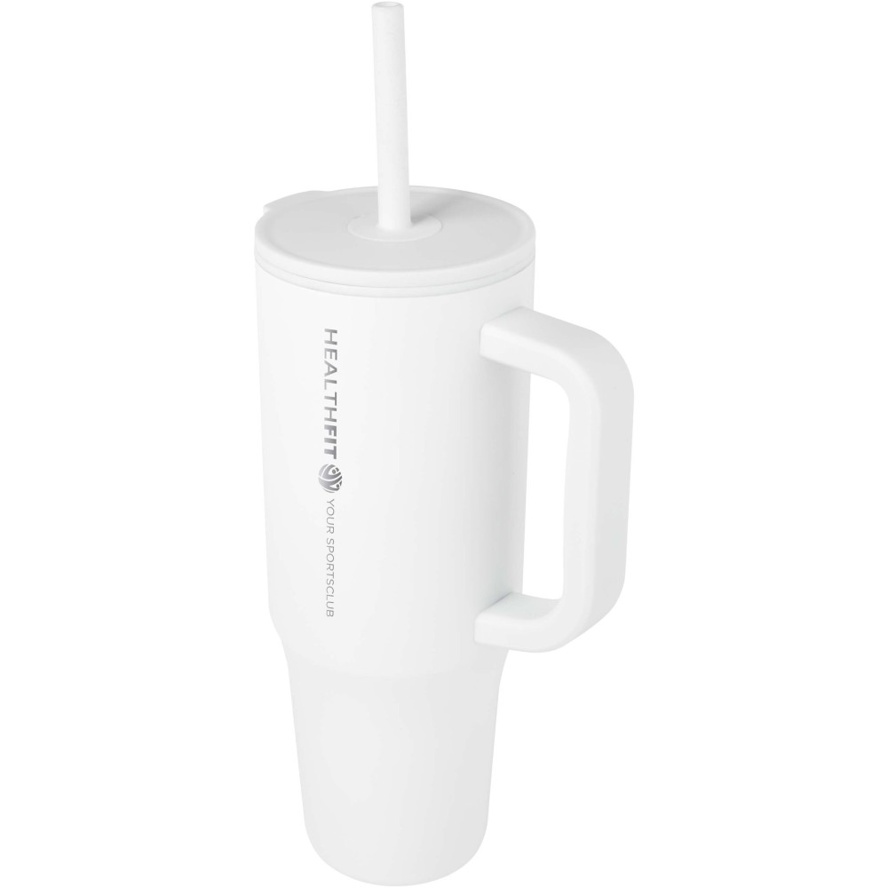 Tumbler with a durable outer wall made from RCS certified recycled stainless steel and inner wall made of plastic. It includes an integrated food grade silicone straw and a splash-proof press-on lid for a smooth drinking experience. This tumbler is also suitable for hot beverages, but it is not advised to drink them using the straw. To let your drink cool down, remove the lid before consuming. Volume capacity: 900 ml. Hand wash only.