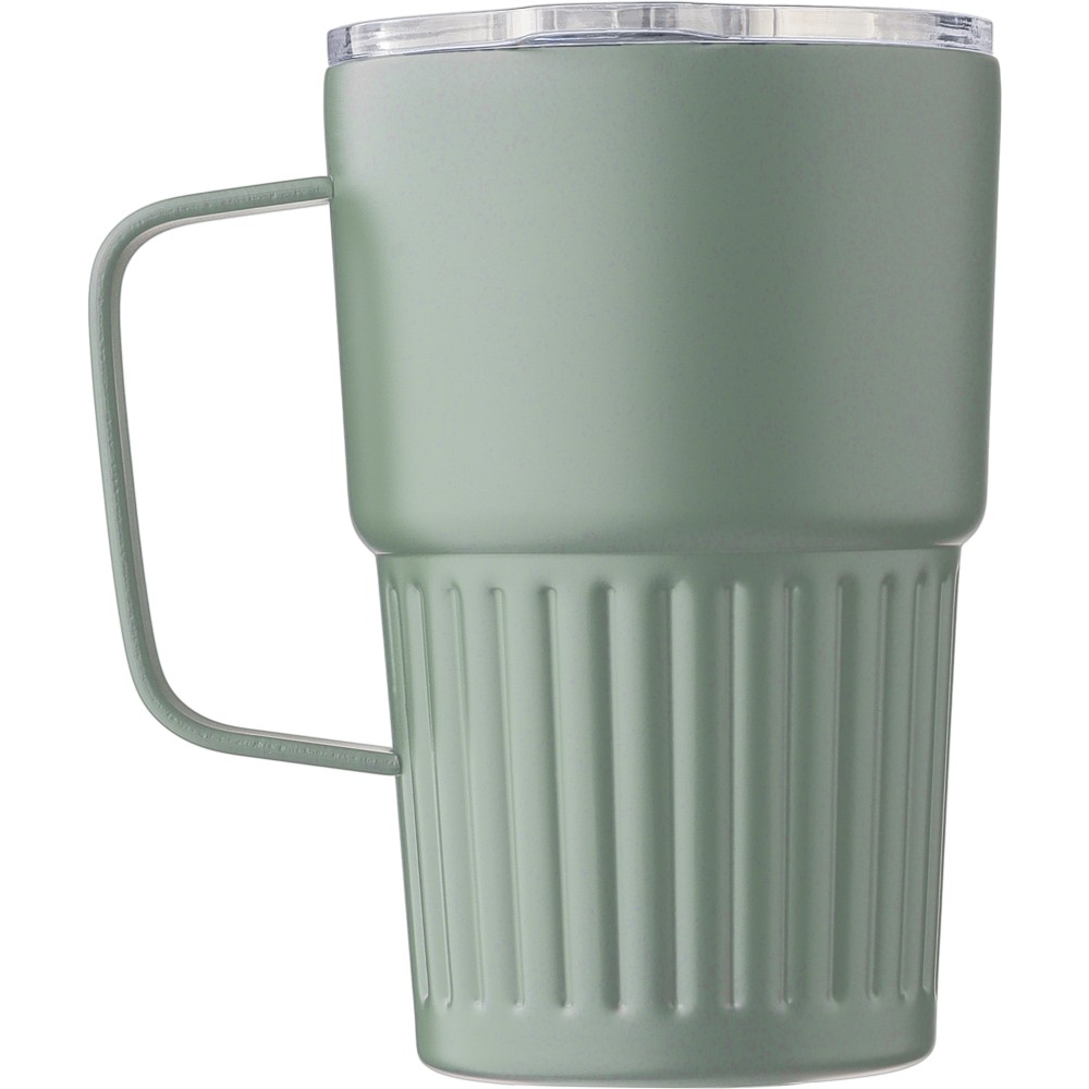Recycled stainless steel double-walled drinking mug (450 ml). The interior is made of stainless steel 304 and the exterior is stainless steel 201 with a ridge grip and sturdy handle. Features an AS lid with a slide closure. Includes an engraved recycled logo on the body. Individually packaged in a brown cardboard box.