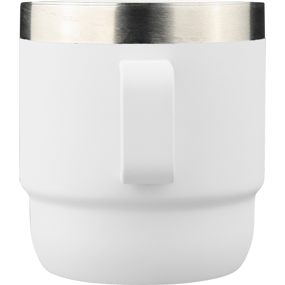 Recycled stainless steel cup (180 ml) with double-wall construction, ceramic inner coating, handle, and laser-engraved recycled stainless steel logo. Packed in a brown cardboard box.