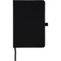 rPET 600D polyester notebook with PU coating, paper size A5. Contains 80 sheets of 70 gsm lined paper and features a ribbon bookmark, elastic band, and pen loop. Semi-hard cover design. Includes an embossed recycled logo on the backside.