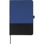 rPET polyester A5 notebook with partly laserable PU front. After engraving, the color matches the rPET fabric. Features 80 lined 70 gsm pages, elastic band, pen loop, and ribbon marker. Lower PU section is designed for engraving to reveal matching color.