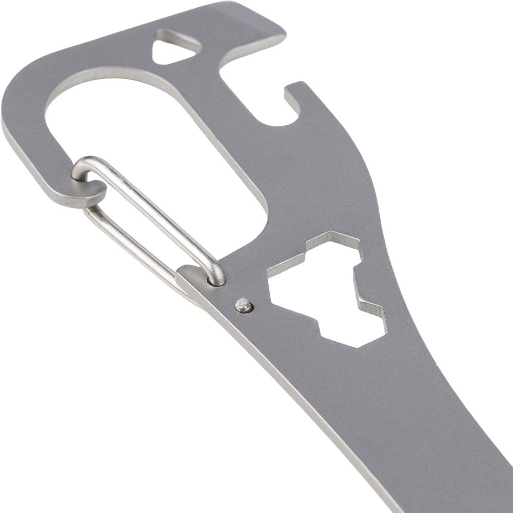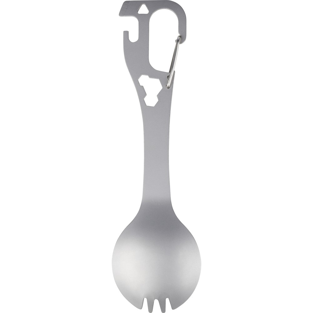 Stainless steel spork with integrated fork and spoon, flat screwdriver, bottle and can opener, and three hex keys in the body. Includes a carabiner clip. Packed per piece in a paper bag.