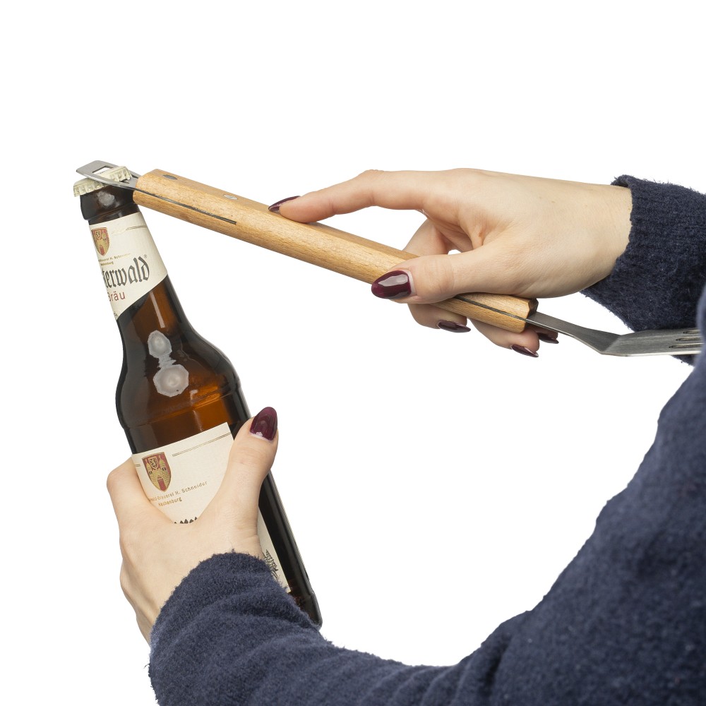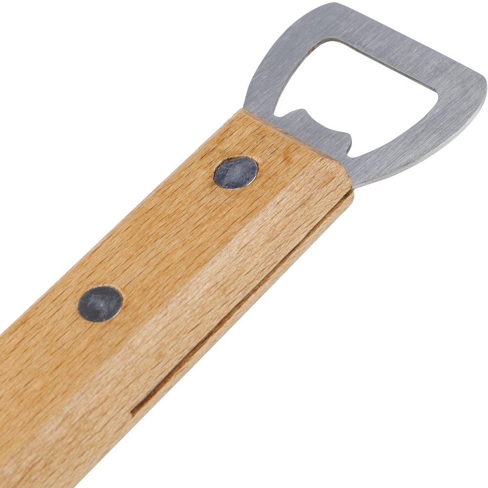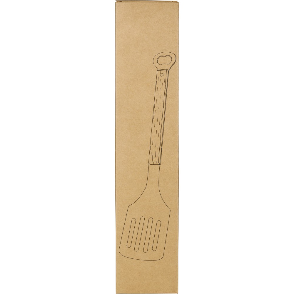 Stainless steel barbecue spatula with beechwood handle and integrated bottle opener at the end. Individually packaged in a brown cardboard box.