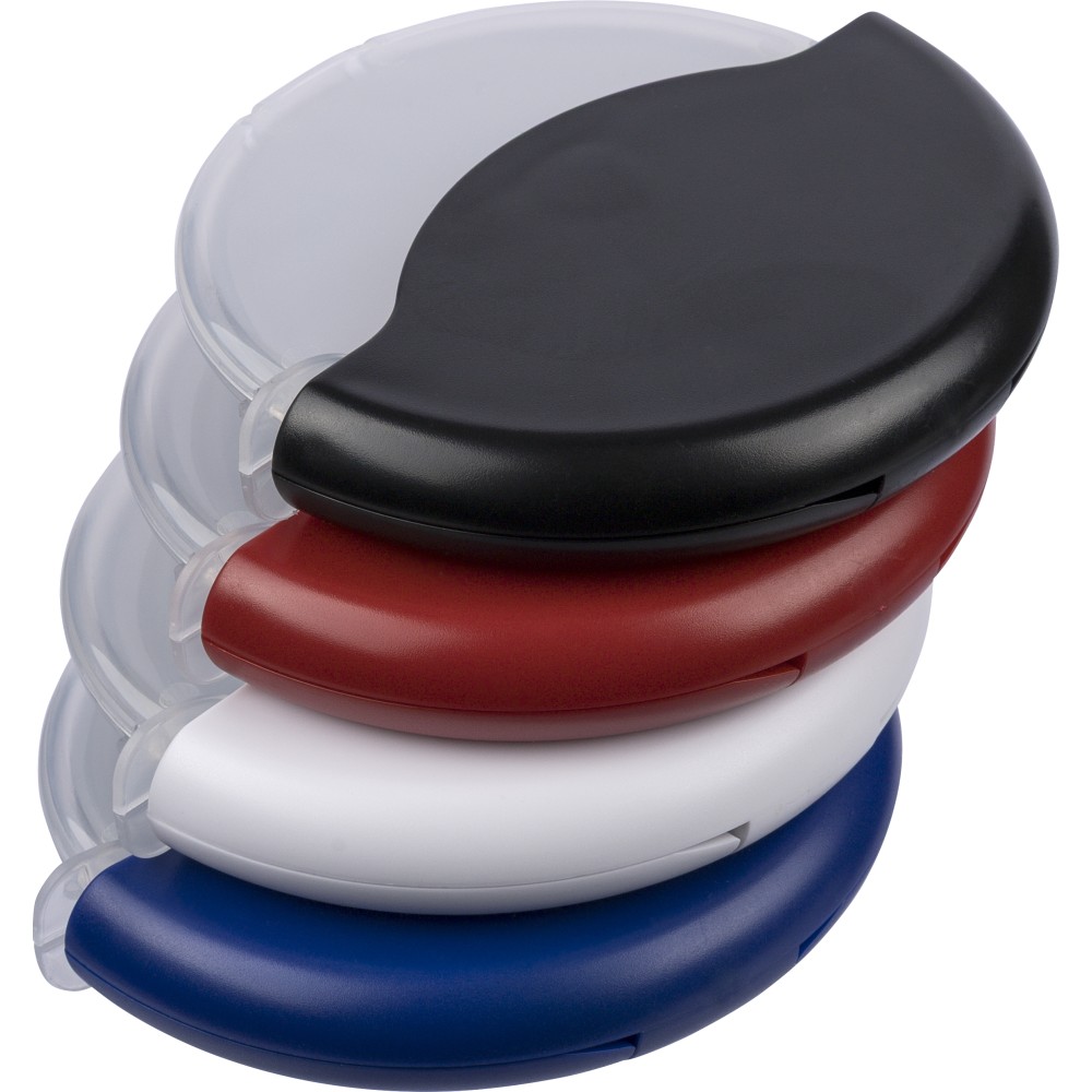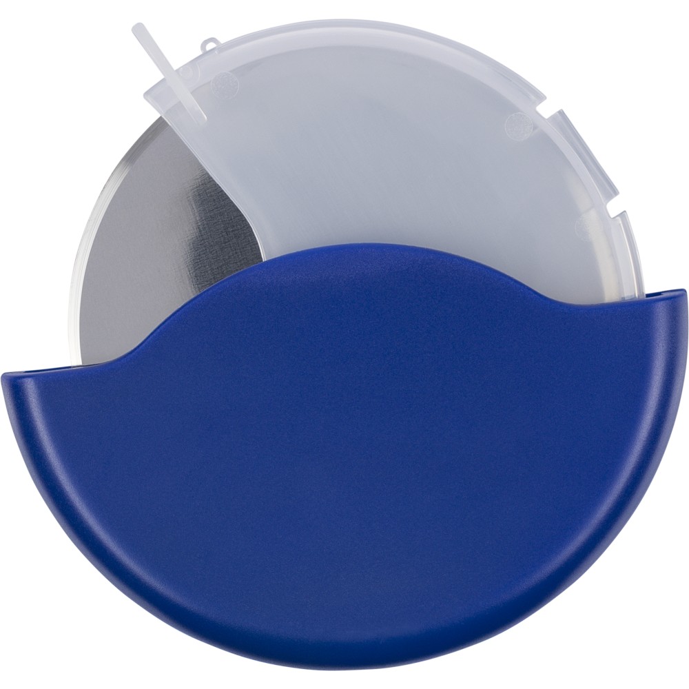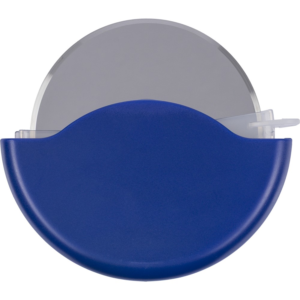 ABS and PP pizza cutter with stainless steel 430 blade. Features a removable cassette that clicks open for easy cleaning and blade access. Packed in a recycled polybag.