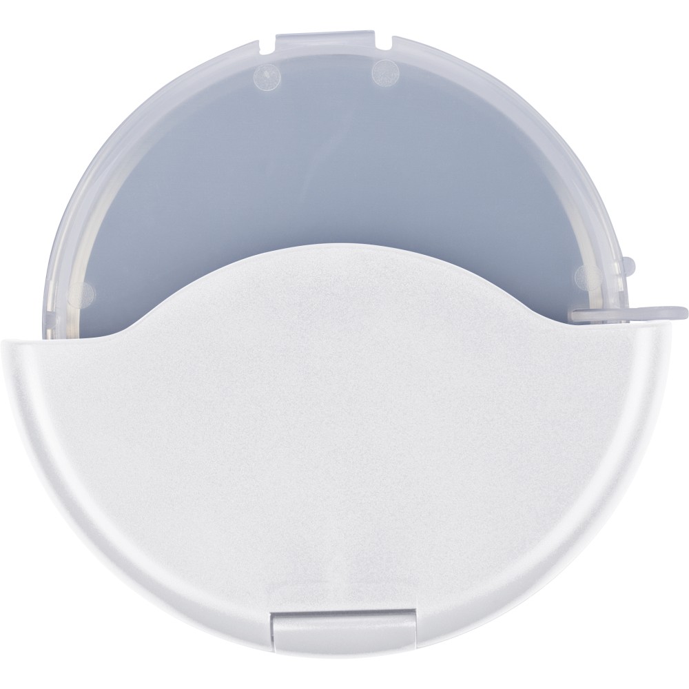 ABS and PP pizza cutter with stainless steel 430 blade. Features a removable cassette that clicks open for easy cleaning and blade access. Packed in a recycled polybag.