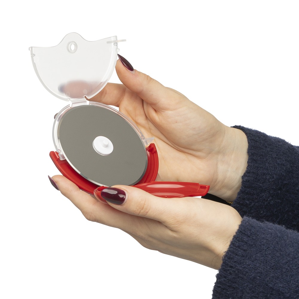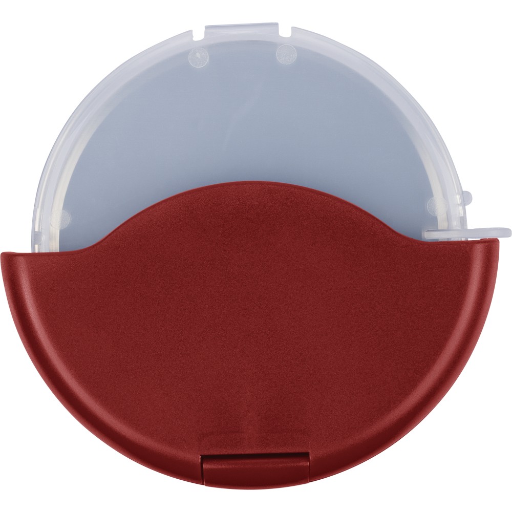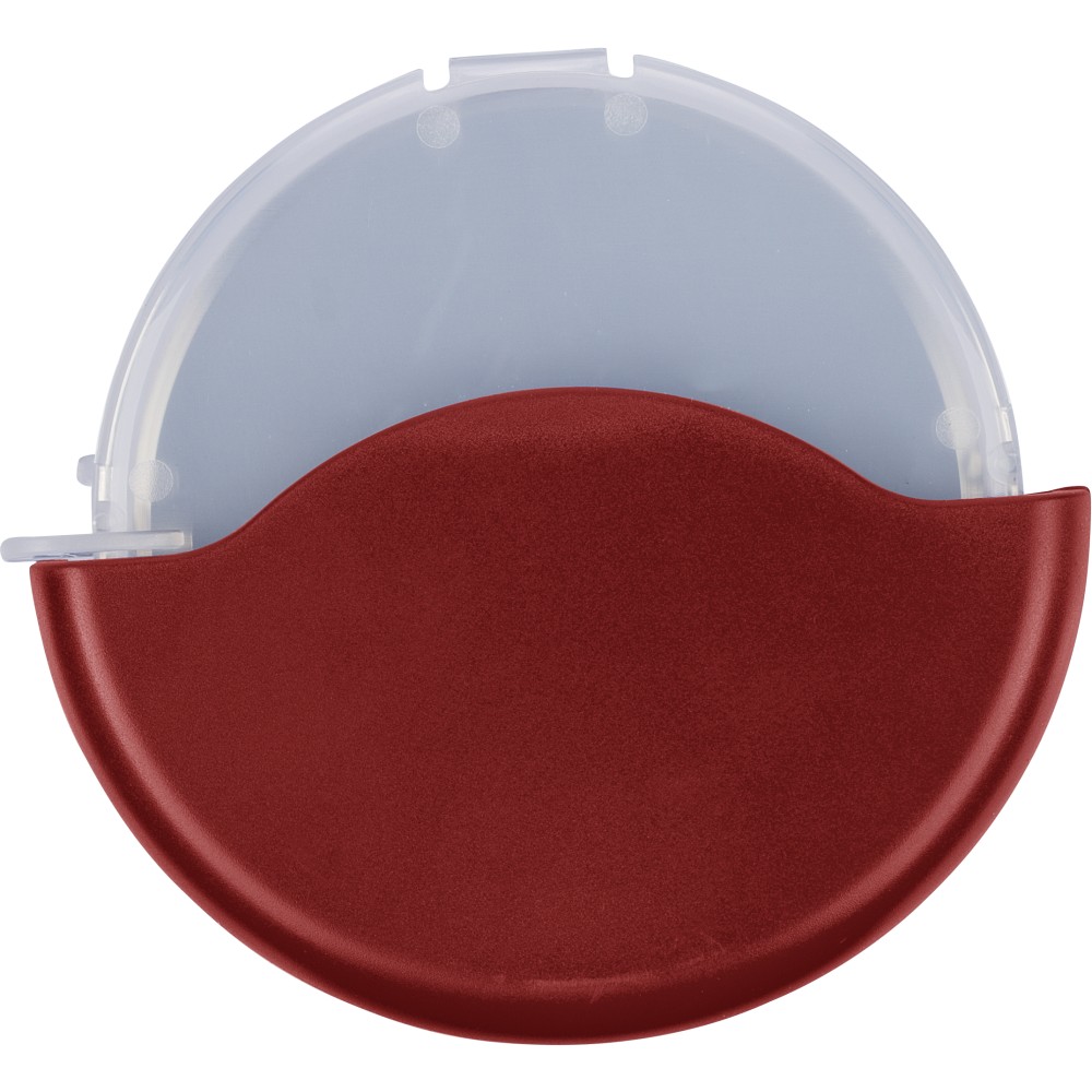ABS and PP pizza cutter with stainless steel 430 blade. Features a removable cassette that clicks open for easy cleaning and blade access. Packed in a recycled polybag.