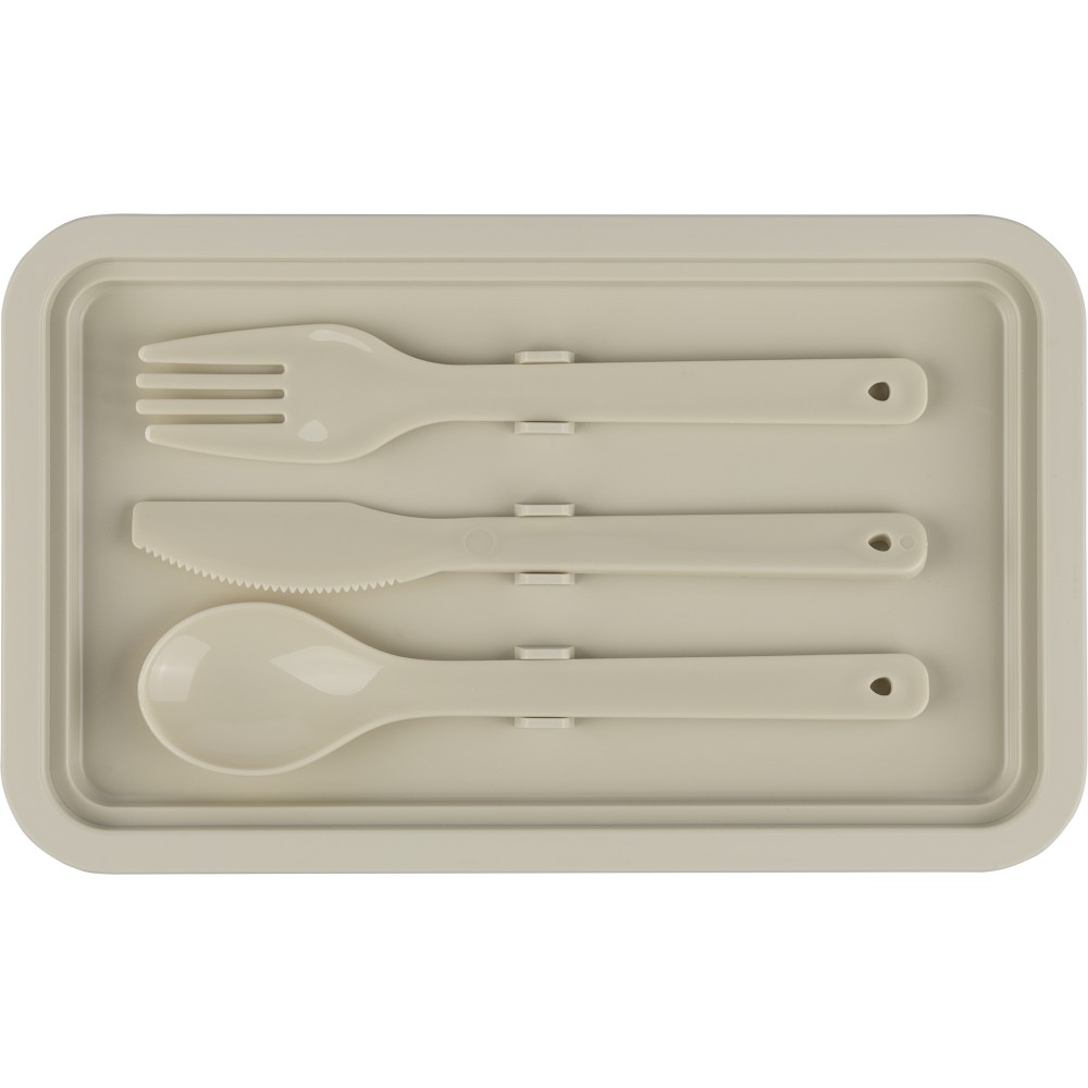 PP two-layer lunchbox with clip closure and PP lid. Features a smaller bottom compartment that stacks into the top to save space. Includes intermediate layer with 3-piece cutlery set. 2,200 ml capacity. Packed in bulk.