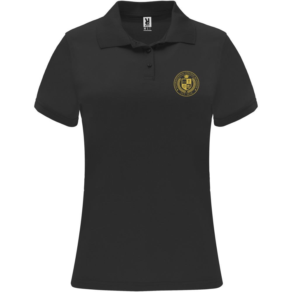 Short-sleeve technical polo shirt for women. Knit collar with three-button placket. Fitted cut. Breathable, easy wash and dry fabric. Removable label. Technical fabric. Breathable fabric. The model is 173 cm and is wearing size S. Piqué knit of 100% Polyester, 150 g/m2.