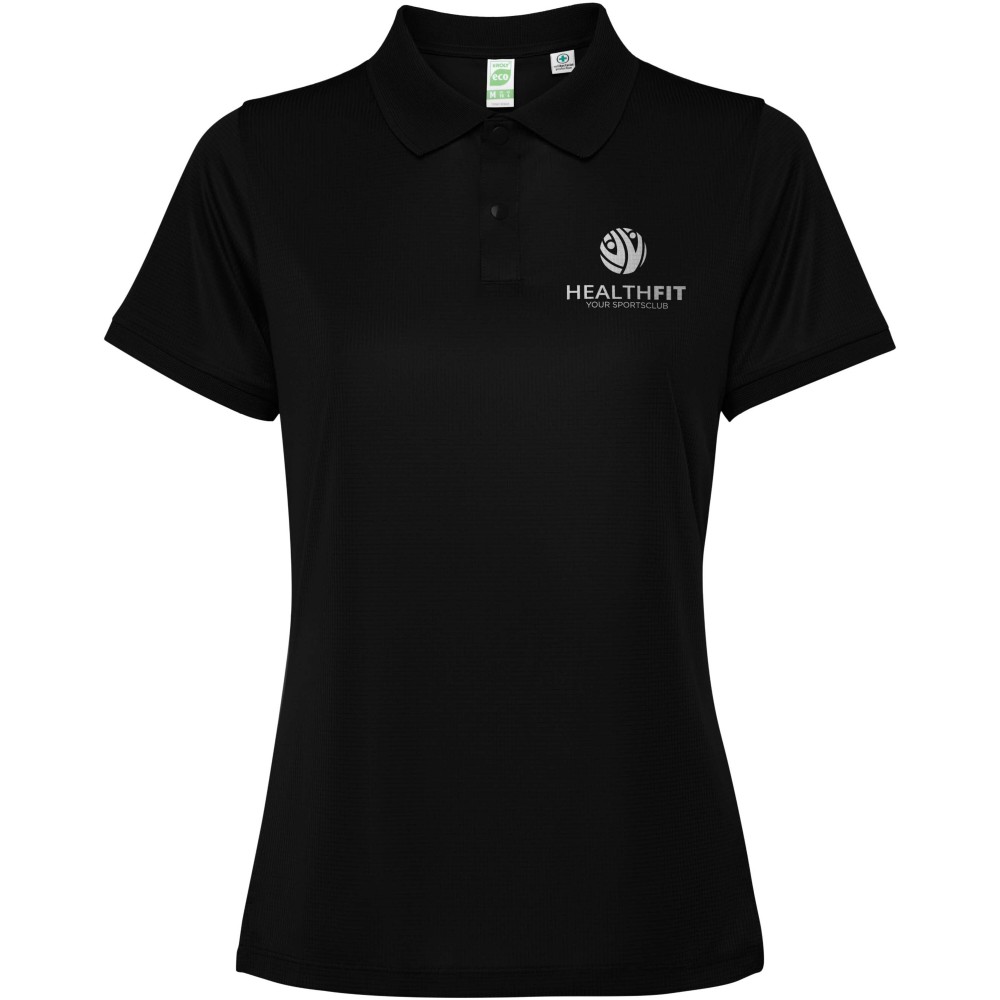 Short-sleeve fitted polo shirt for women. Reinforced covered seams in interior collar. 1x1 ribbed cuffs and collar. Side seams. 3-button placket and side slits.