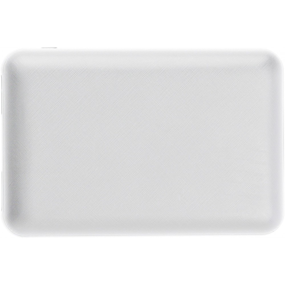 ABS power bank with a capacity of 10.000 mAh. Input DC 5V/1500mA. Output DC 5V/1000mA, 2100mA. LED light indicators. It has two standard USB ports and one micro USB port. Cable included.
