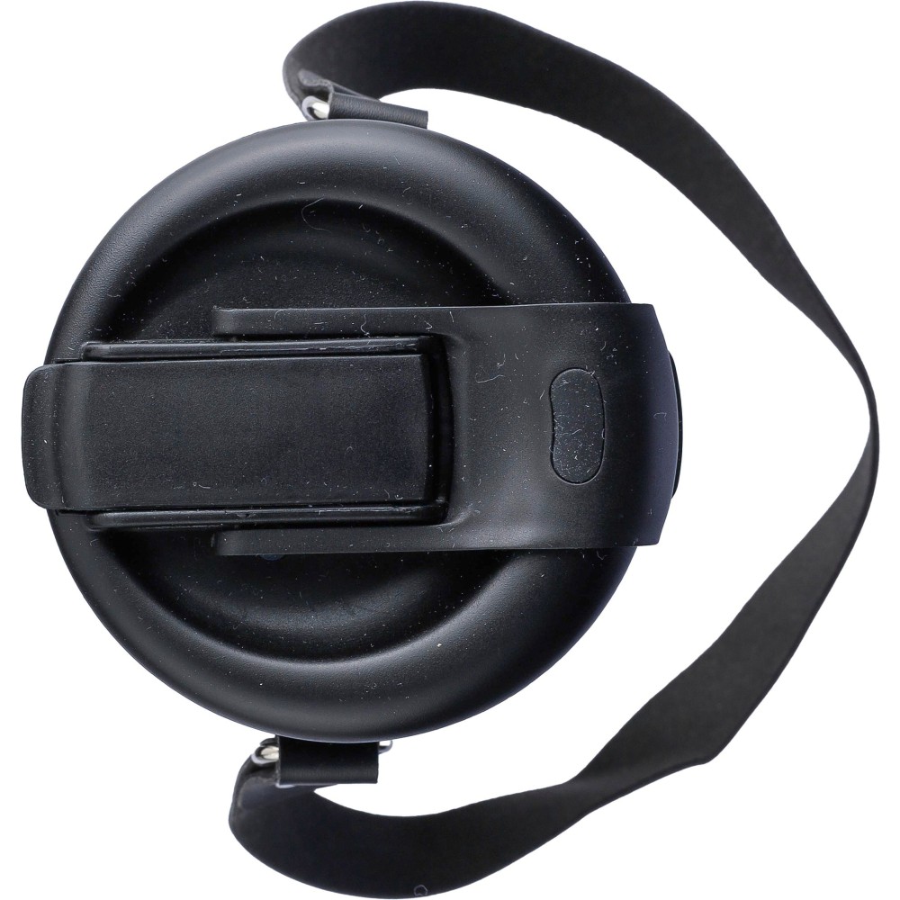 Stainless steel double-walled drinking bottle (730 ml) with a PU carrying sleeve, straw, and strap. The interior is made of stainless steel 304, and the exterior is stainless steel 201. PP lid with a push button to open or close the spout, and a separate drinking opening. Keeps contents hot for 6 hours and cold for 10 hours. Individually packaged in a brown cardboard box.