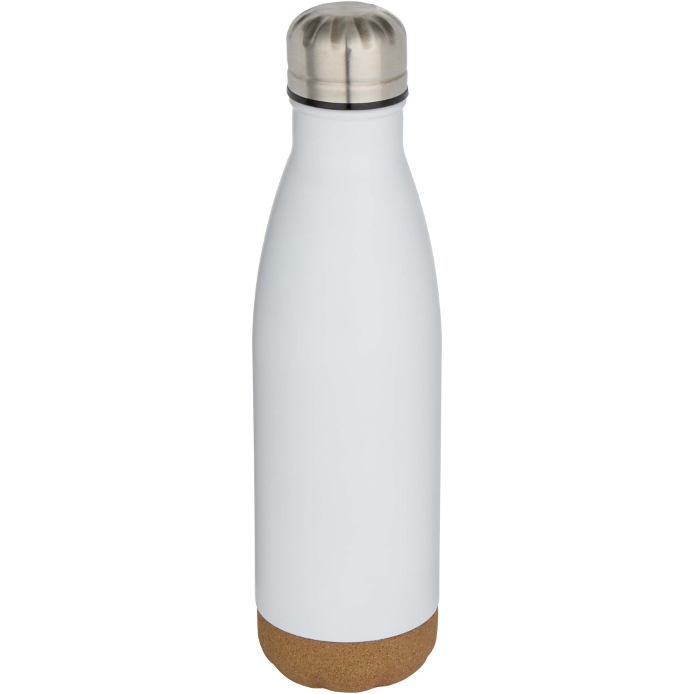 Vacuum insulated stainless steel water bottle with cork details at the bottom. The double-wall insulation keeps drinks hot for 12 hours and cold for 48 hours. Presented in a recycled cardboard gift box. Volume capacity: 500 ml.