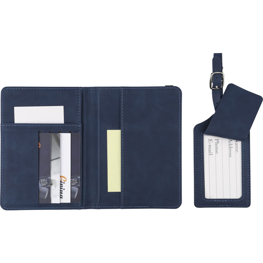 Recycled PU passport holder and recycled PU luggage label packed together in a brown carton box with illustration. The passport holder features ?passport? printed on the front and has two inside slots for securely holding a passport. Both items are finished with an embossed recycled logo.