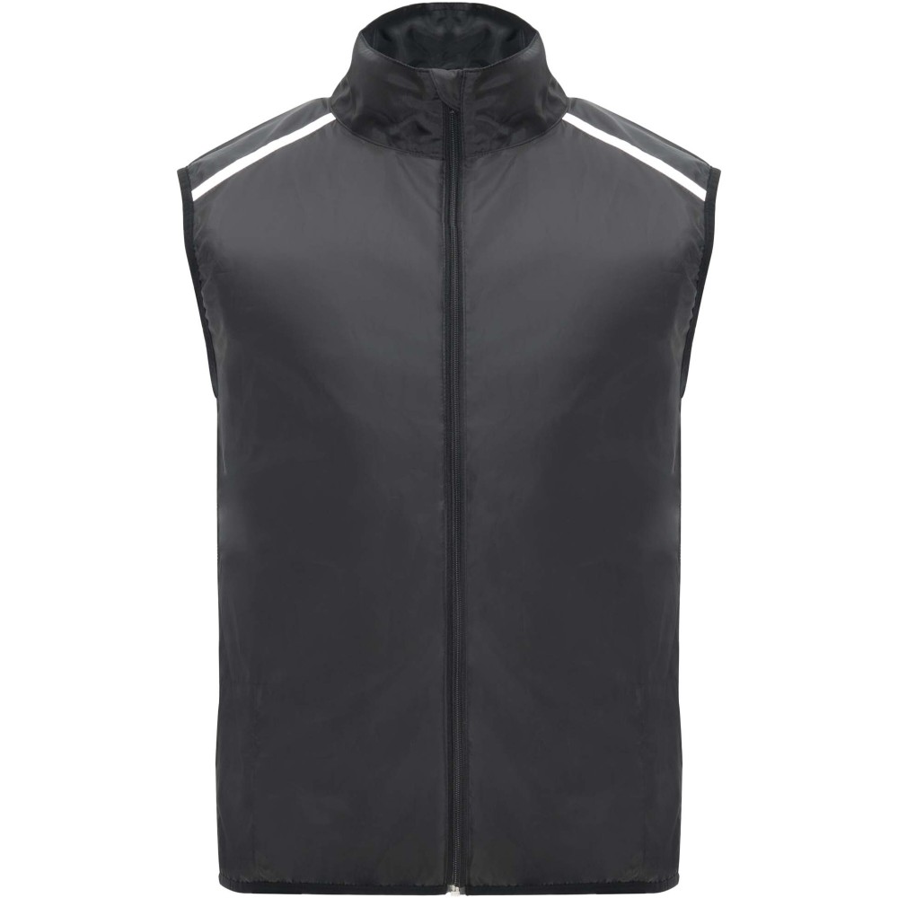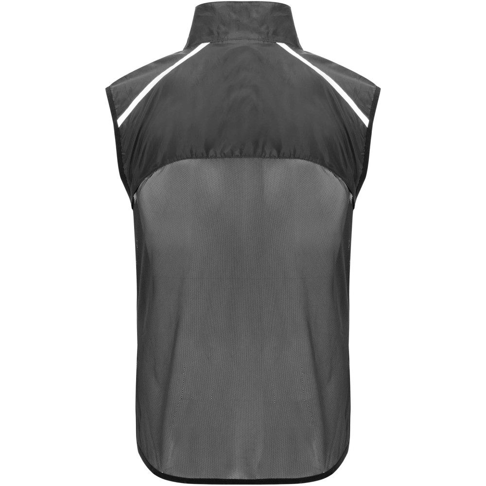 Wind-proof and breathable. Front zip with matching chin protector. Elastic binding at armhole and bottom. Bottom part of the back in microperforated fabric. High-visibility details on the top, front and back. Pocket with elastic strap to stow the vest and wear it on the wrist. Removable label.