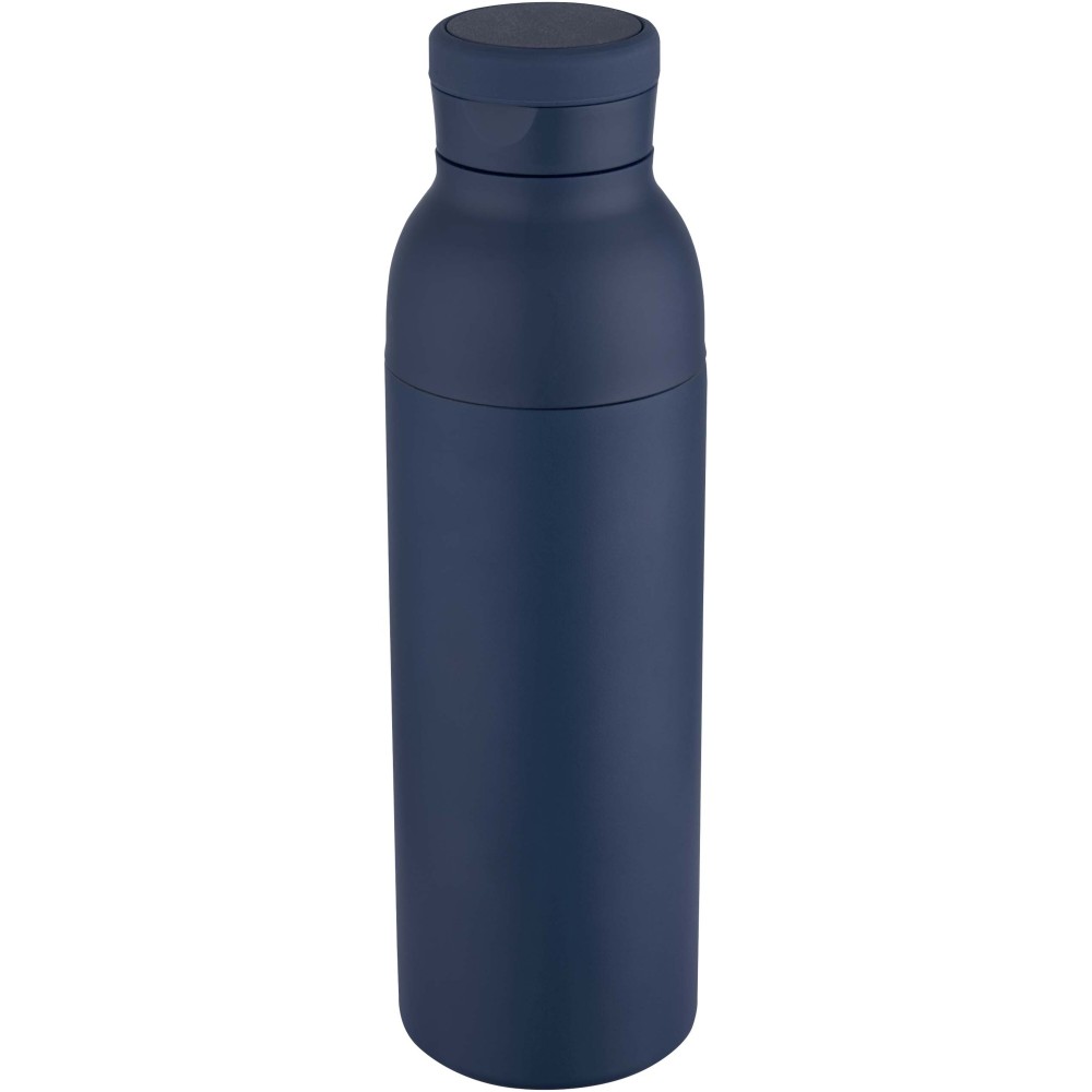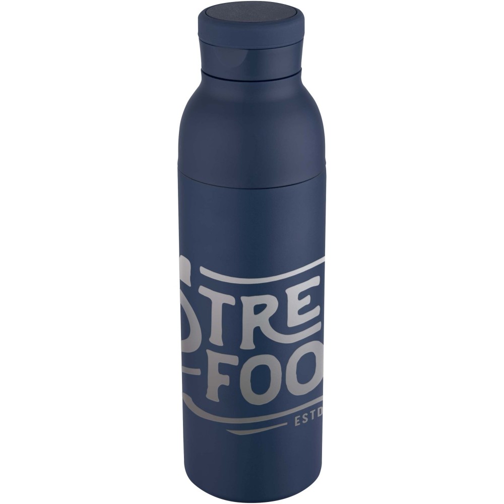 Double-walled, vacuum-insulated, RCS certified stainless steel water bottle featuring a discreet built-in silicone handle within the lid. Keeps drinks cold for 48 hours or hot for 12 hours. The two-piece construction makes cleaning easy, while the durable powder coating and copper plating ensure long-lasting performance. Presented in a recycled cardboard gift box. Volume capacity: 650 ml.