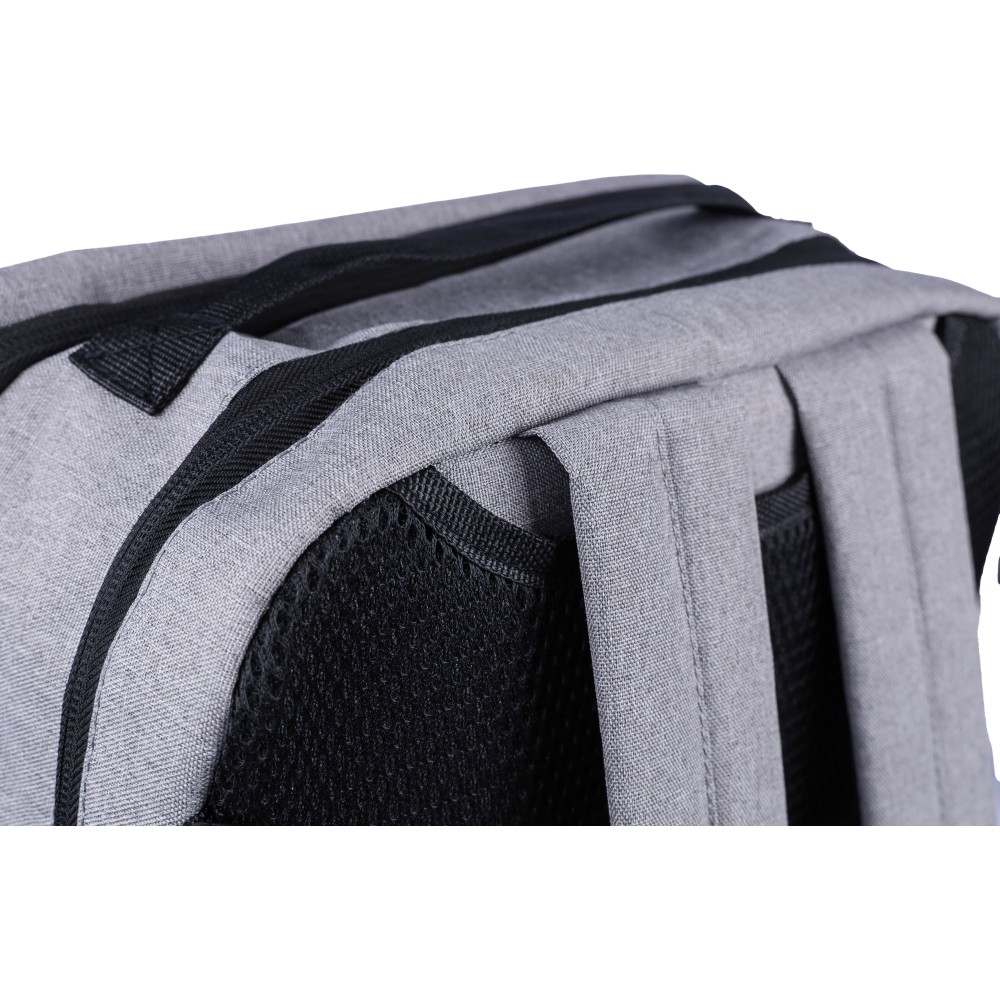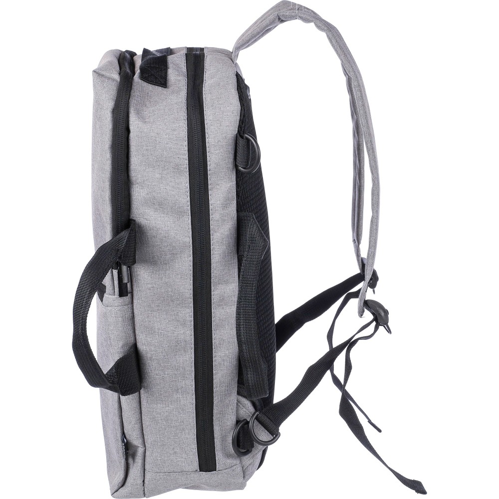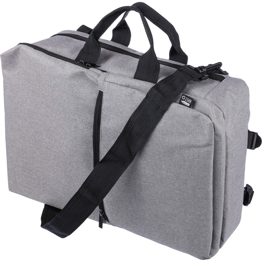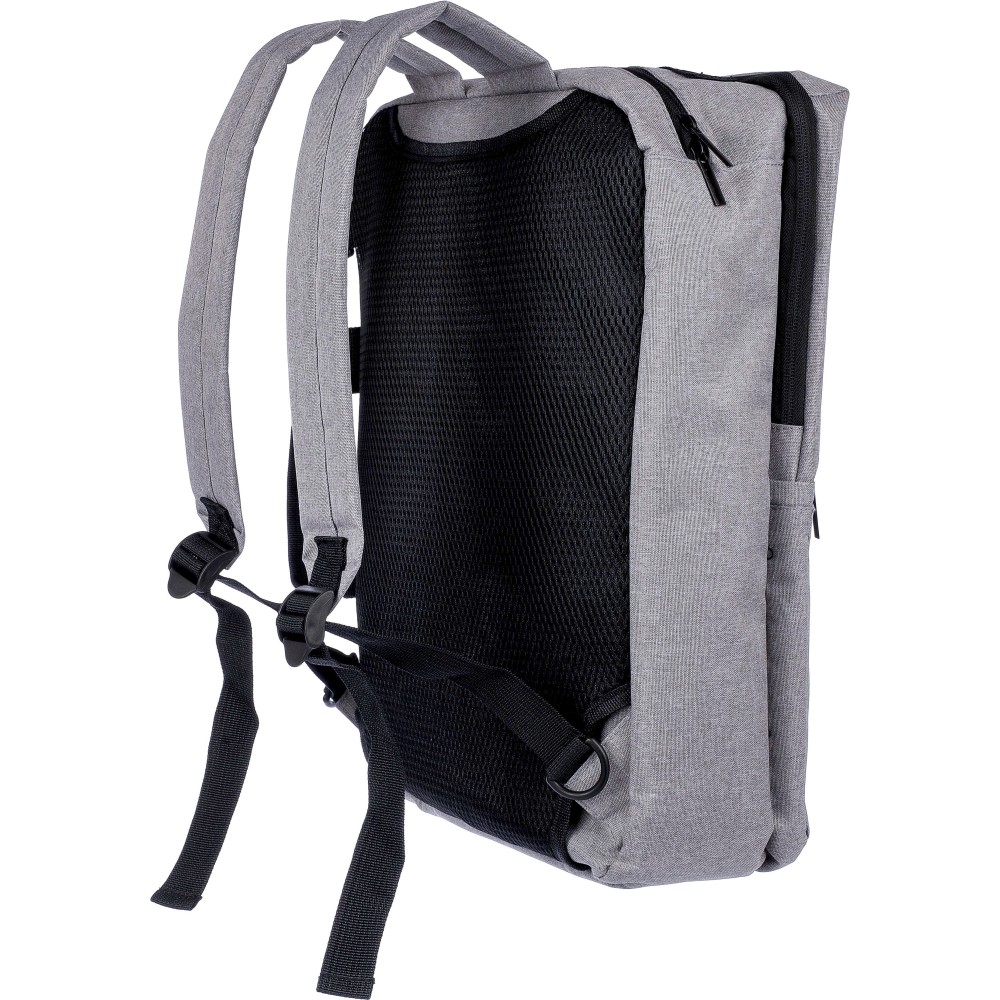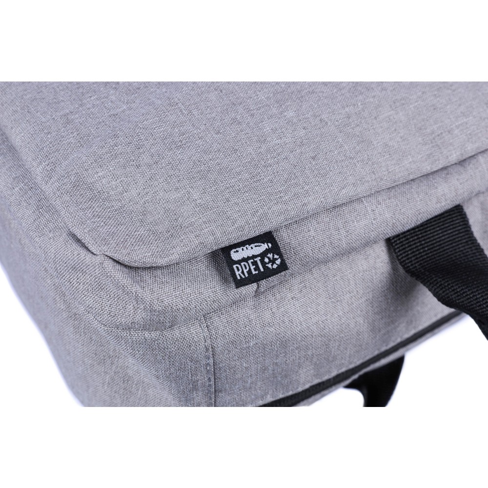 rPET polyester (300D) backpack and laptop bag (15 inch) with 210D lining inside. Cabin-proof. With carrying loop on top, adjustable shoulder straps, and two carrying handles on the side. Adjustable straps tuck behind the padding for a carry function with side handles. Velcro laptop compartment and small zippered compartment. With ventilated padded backing. Carrying weight approx. 8 kg. Includes rPET label.