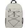 rPET polyester 600D adventure backpack with drawstring closure and large zippered main compartment. Features mesh side pockets, elastic front bands, small front zip pocket for decoration, adjustable straps, and rPET label.