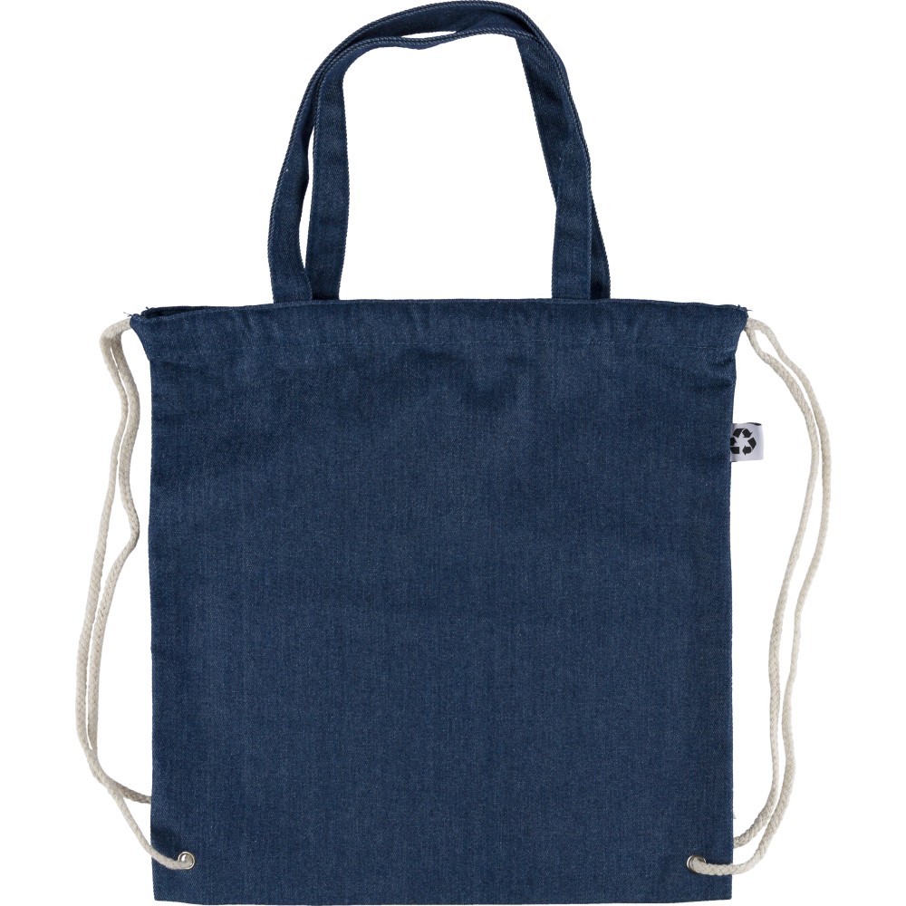 Recycled denim drawstring bag with size 40 x 38 cm. Features long handles of 2.5 x 50 cm and a pull cord for closing. Includes a recycled label on the outside and can be carried by shoulder straps or hand loop.