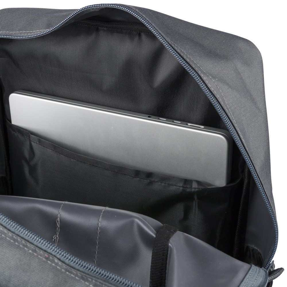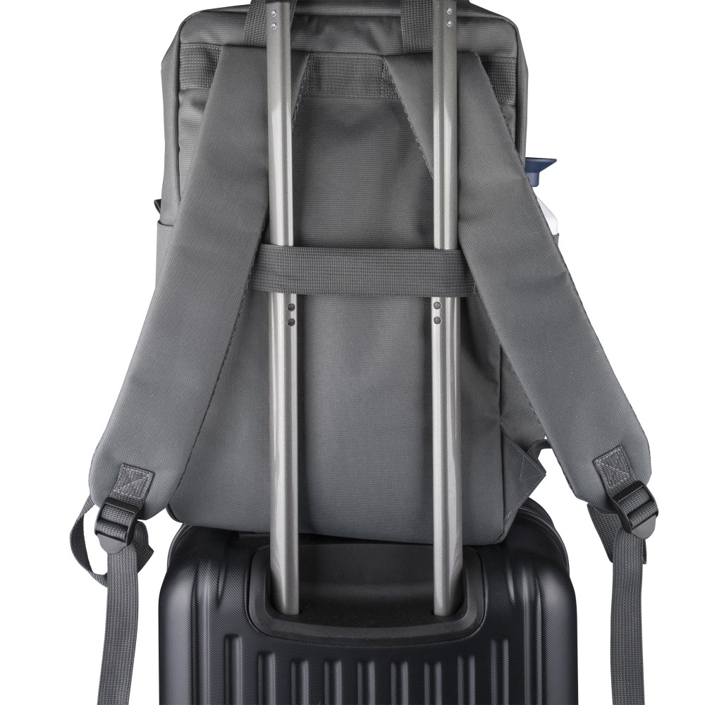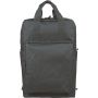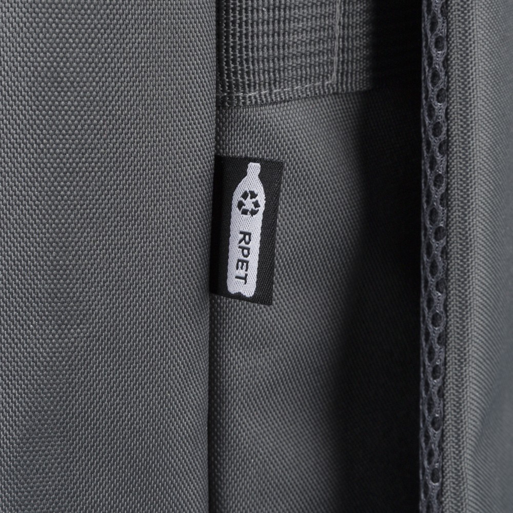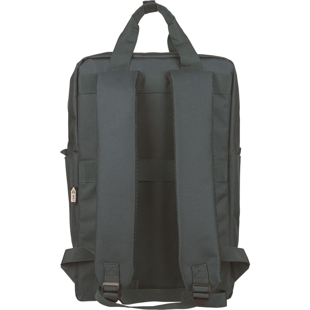 Recycled 900D polyester backpack with 210D lining and rPET label. Includes large main compartment with 16? laptop pocket, front compartment, two side pockets, trolley strap, top handles with button, and ventilated shoulder straps.