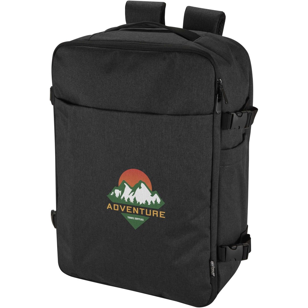 Made from GRS certified recycled polyester with an RPET lining, the Libra 17" carry-on backpack is designed to comply with airline cabin luggage requirements, making it an ideal travel companion. It includes a dedicated laptop compartment for devices up to 17", a spacious main section with elastic straps and mesh dividers to keep belongings secure and organised, and two large front zippered pockets for easy access to essentials. For comfort and convenience, the backpack features a breathable back panel, a trolley strap, adjustable shoulder straps with a cross-chest strap, and both top and side handles for versatile carrying options. Suitable for business trips, remote work, or weekend travel, this backpack combines a sleek design with practical functionality for life on the move.