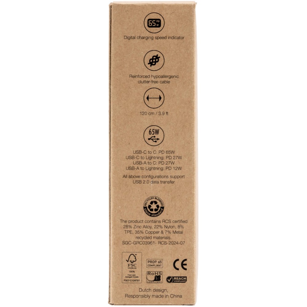 The BrandCharger Thor Eco 4-in-1 Cable offers fast charging up to 65W and supports USB 2.0 data transfer. Made from recycled nylon, the 120 cm cable includes Type-C and USB-A inputs, with Type-C and Lightning outputs. Combines sustainability, versatility, and high performance in one essential cable.