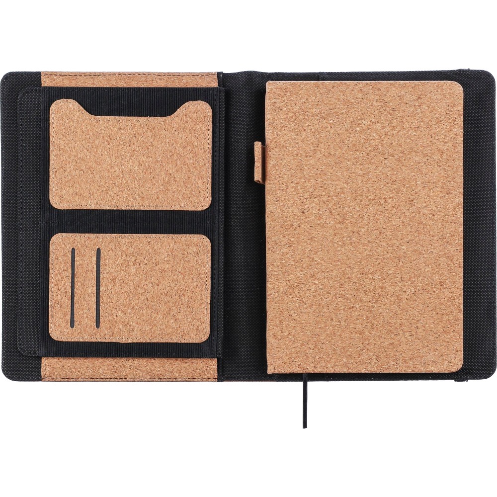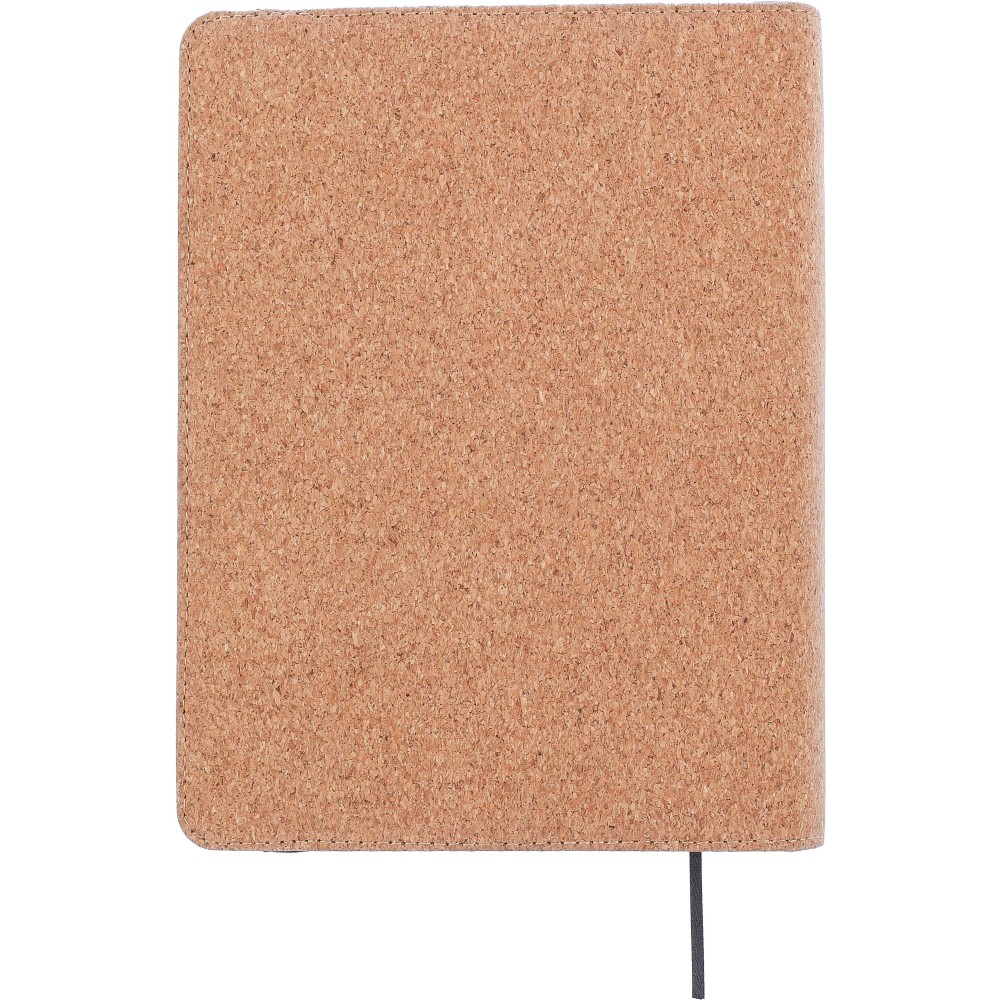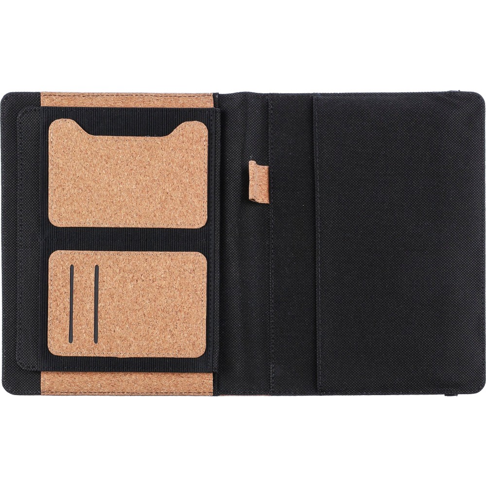 Cork portfolio, approx. A5 size. With inside pockets, elastic closure band, pen loop, and removable A5 notebook with 192 lined recycled paper sheets (70 gsm). Packaged in tissue paper.