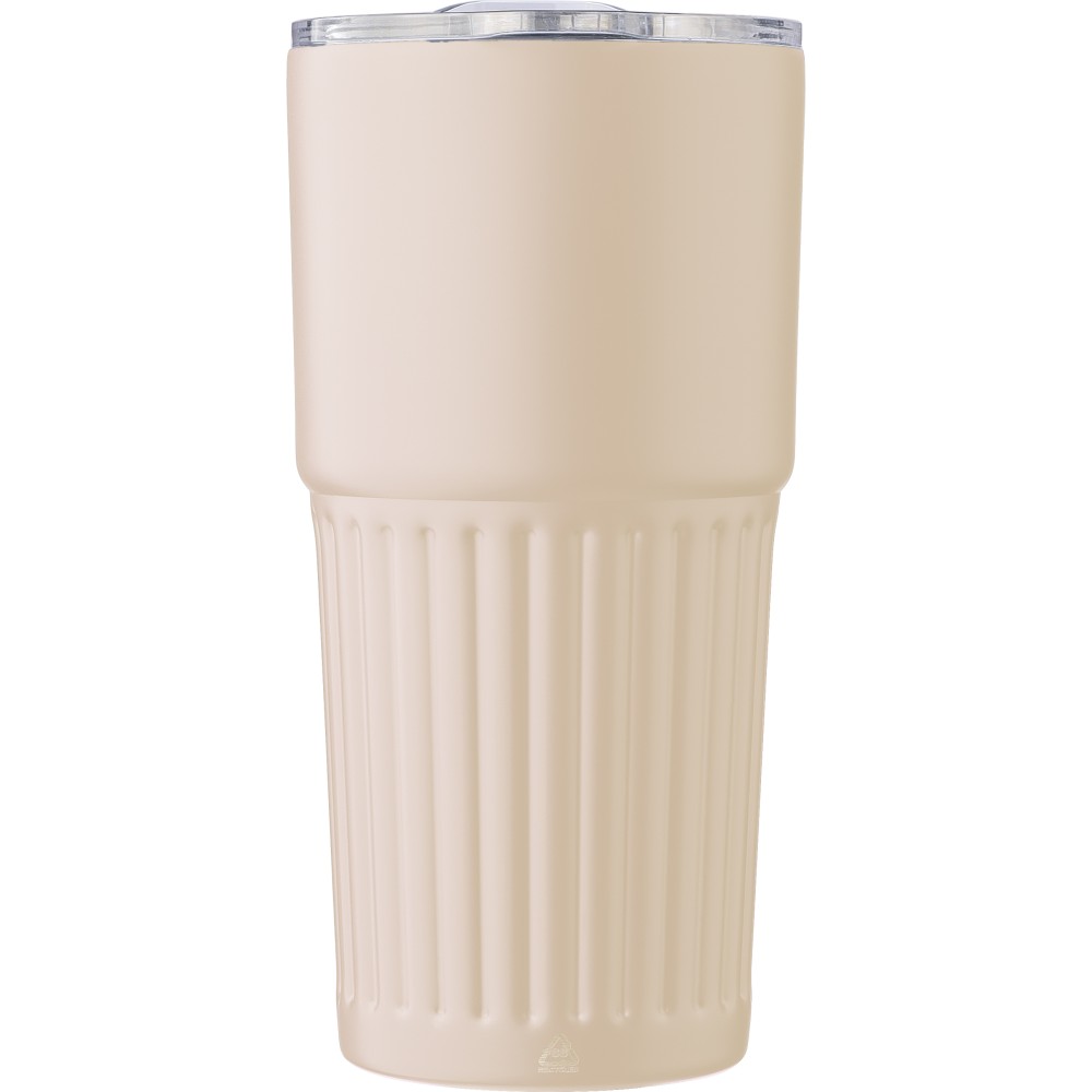 Recycled stainless steel double-walled drinking mug (500 ml). The interior is made of stainless steel 304 and the exterior is stainless steel 201 with a ridge grip design. Features an AS lid with a slide closure. Includes an engraved recycled logo on the body. Individually packaged in a brown cardboard box.