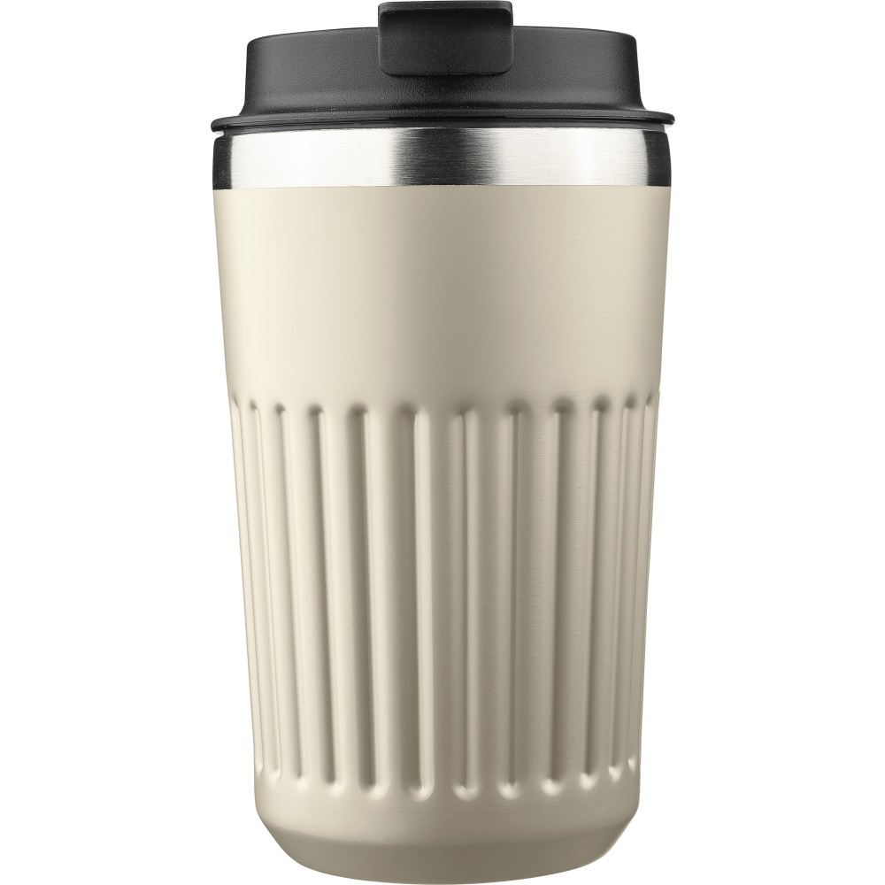 Recycled stainless steel travel mug (400 ml) with double wall and outer ridges. Inner 304 stainless steel, outer 201 stainless steel, with PP lid. Engraved recycled logo on the body. Packed in brown cardboard box.