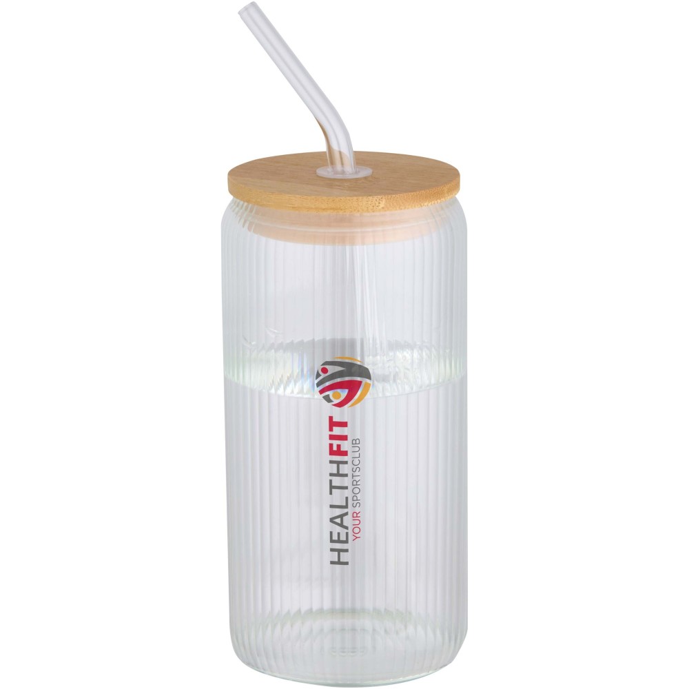 Borosilicate glass jar with a glass straw and bamboo lid. The jar has a unique ribbed design on the interior and a smooth exterior, ideal for printing a logo. The bamboo used is sourced sustainably, with respect for environmental and social responsibility. Supplied in a recycled cardboard gift box. Volume capacity: 650 ml.